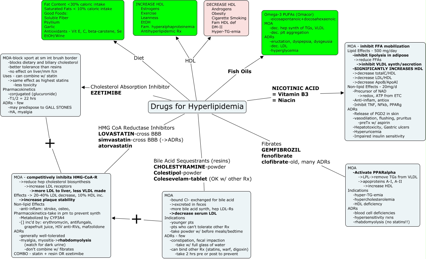 This Concept Map, created with IHMC CmapTools, has information related to: Hyperlipidemia, Drugs for Hyperlipidemia Diet Fat Content ណ% caloric intake Saturated Fats < 10% caloric intake Good Foods: Soluble Fiber Psyllium Garlic Antioxidants - Vit E, C, beta-carotene, Se EtOH/Wine, Drugs for Hyperlipidemia Fibrates GEMFIBROZIL fenofibrate clofibrate-old, many ADRs MOA -Activate PPARalpha ->LPL->remove TGs from VLDL ->apoproteins A-I, A-II ->increase HDL Indications -hyper-TG-emia -hypercholesterolemia -HDL deficiency ADRs -blood cell deficiencies -hypersensitivity rxns -rhabdomyolysis (no statins!!), Drugs for Hyperlipidemia HDL DECREASE HDL Androgens Obesity Cigarette Smoking Fam HDL def DM-II Hyper-TG-emia, Drugs for Hyperlipidemia Fish Oils Omega-3 PUFAs (Omacor) -eicosapentanoic+docosahexaenoic MOA -dec. hep synth of TGs, VLDL -dec. plt aggregation ADRs -eructation, dyspepsia, dysgeusia -dec. LDL -hyperglycemia, Drugs for Hyperlipidemia NICOTINIC ACID = Vitamin B3 = Niacin MOA - inhibit FFA mobilization Lipid Effects - 500 mg/day -inhibit lipolysis in adipose ->reduce FFAs ->inhibit VLDL synth/secretion -SIGNIFICANTLY INCREASES HDL ->decrease totalC/HDL ->decrease LDL/HDL ->decrease ApoB/ApoAI Non-lipid Effects - 20mg/d -Precursor of NAD ->redox, ATP from ETC -Anti-inflam, antiox -Inhibit TNF, NFkb, PPARg ADRs -Release of PGD2 in skin -vasodilation, flushing, pruritus -preTx w/ aspirin -Hepatotoxicity, Gastric ulcers -Hyperuricemia -Impaired insulin sensitivity, MOA-block xport at sm int brush border -blocks dietary and biliary cholesterol -better tolerance than resins -no effect on liver/mm fcn Uses - can combine w/ statin ->same effect as highest statins -less toxicity Pharmacokinetics -conjugated (glucuronide) -T1/2 = 22 hrs ADRs - few -may predispose to GALL STONES -HA, myalgia + MOA - competitively inhibits HMG-CoA-R ->reduce hep cholesterol biosynthesis ->increase LDL receptors ->more LDL to liver, less VLDL made Effects -> 20-40% LDL decrease, 10% HDL inc. ->increase plaque stability Non-lipid Effects -anti-inflam: stroke, osteo, Pharmacokinetics-take in pm to prevent synth -Metabolized by CYP3A4 -[] inc'd by: erythromycin, antifungals, grapefruit juice, HIV anti-RVs, mafzolidone ADRs -generally well-tolerated -myalgia, myositis->rhabdomyolysis (watch for dark urine) -don't combine w/ fibrates COMBO - statin + resin OR ezetimibe, Drugs for Hyperlipidemia HDL INCREASE HDL Estrogens Exercise Leanness EtOH Fam. hyperalphaproteinemia Antihyperlipidemic Rx, MOA -bound Cl- exchanged for bile acid ->excreted in feces -more bile acid synth, hep LDL-Rs ->decrease serum LDL Indications -younger pts -pts who can't tolerate other Rx -take powder w/ before meals/bedtime ADRs - few -constipation, fecal impaction -take w/ full glass of water -can bind other Rx (statins, warf, digoxin) -take 2 hrs pre or post to prevent + MOA - competitively inhibits HMG-CoA-R ->reduce hep cholesterol biosynthesis ->increase LDL receptors ->more LDL to liver, less VLDL made Effects -> 20-40% LDL decrease, 10% HDL inc. ->increase plaque stability Non-lipid Effects -anti-inflam: stroke, osteo, Pharmacokinetics-take in pm to prevent synth -Metabolized by CYP3A4 -[] inc'd by: erythromycin, antifungals, grapefruit juice, HIV anti-RVs, mafzolidone ADRs -generally well-tolerated -myalgia, myositis->rhabdomyolysis (watch for dark urine) -don't combine w/ fibrates COMBO - statin + resin OR ezetimibe, Drugs for Hyperlipidemia Bile Acid Sequestrants (resins) CHOLESTYRAMINE-powder Colestipol-powder Colesevelam-tablet (OK w/ other Rx) MOA -bound Cl- exchanged for bile acid ->excreted in feces -more bile acid synth, hep LDL-Rs ->decrease serum LDL Indications -younger pts -pts who can't tolerate other Rx -take powder w/ before meals/bedtime ADRs - few -constipation, fecal impaction -take w/ full glass of water -can bind other Rx (statins, warf, digoxin) -take 2 hrs pre or post to prevent, Drugs for Hyperlipidemia Cholesterol Absorption Inhibitor EZETIMIBE MOA-block xport at sm int brush border -blocks dietary and biliary cholesterol -better tolerance than resins -no effect on liver/mm fcn Uses - can combine w/ statin ->same effect as highest statins -less toxicity Pharmacokinetics -conjugated (glucuronide) -T1/2 = 22 hrs ADRs - few -may predispose to GALL STONES -HA, myalgia, Drugs for Hyperlipidemia HMG CoA Reductase Inhibitors LOVASTATIN-cross BBB simvastatin-cross BBB (->ADRs) atorvastatin MOA - competitively inhibits HMG-CoA-R ->reduce hep cholesterol biosynthesis ->increase LDL receptors ->more LDL to liver, less VLDL made Effects -> 20-40% LDL decrease, 10% HDL inc. ->increase plaque stability Non-lipid Effects -anti-inflam: stroke, osteo, Pharmacokinetics-take in pm to prevent synth -Metabolized by CYP3A4 -[] inc'd by: erythromycin, antifungals, grapefruit juice, HIV anti-RVs, mafzolidone ADRs -generally well-tolerated -myalgia, myositis->rhabdomyolysis (watch for dark urine) -don't combine w/ fibrates COMBO - statin + resin OR ezetimibe