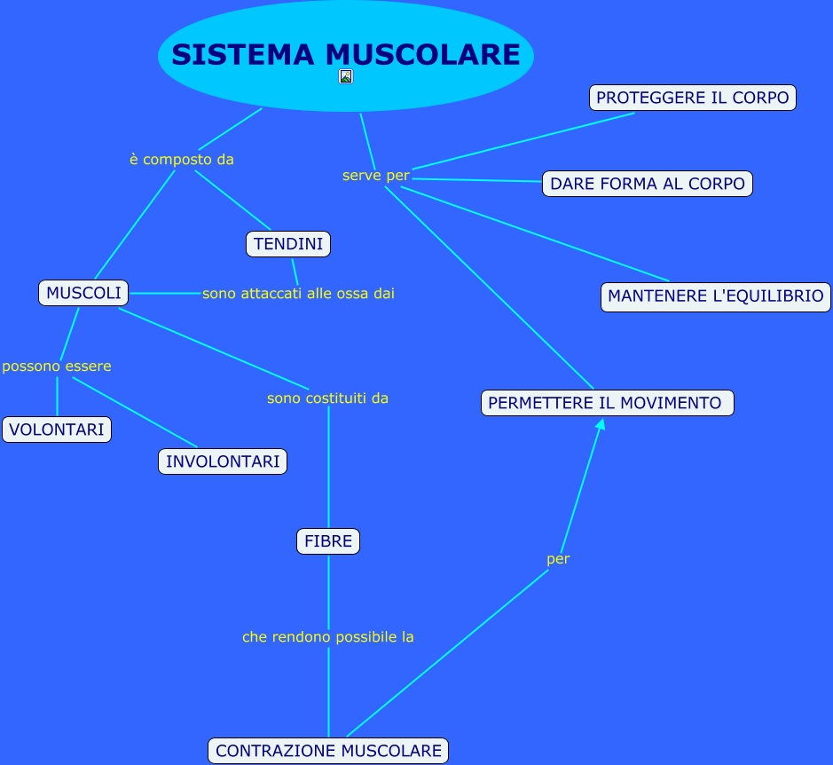 Questa Cmap, creata con IHMC CmapTools, contiene informazioni relative a: SISTEMA MUSCOLARE, MUSCOLI sono costituiti da FIBRE, MUSCOLI possono essere VOLONTARI, SISTEMA MUSCOLARE serve per PROTEGGERE IL CORPO, SISTEMA MUSCOLARE serve per DARE FORMA AL CORPO, CONTRAZIONE MUSCOLARE per PERMETTERE IL MOVIMENTO, SISTEMA MUSCOLARE serve per PERMETTERE IL MOVIMENTO, MUSCOLI possono essere INVOLONTARI, SISTEMA MUSCOLARE serve per MANTENERE L'EQUILIBRIO, MUSCOLI sono attaccati alle ossa dai TENDINI, SISTEMA MUSCOLARE è composto da TENDINI, SISTEMA MUSCOLARE è composto da MUSCOLI, FIBRE che rendono possibile la CONTRAZIONE MUSCOLARE