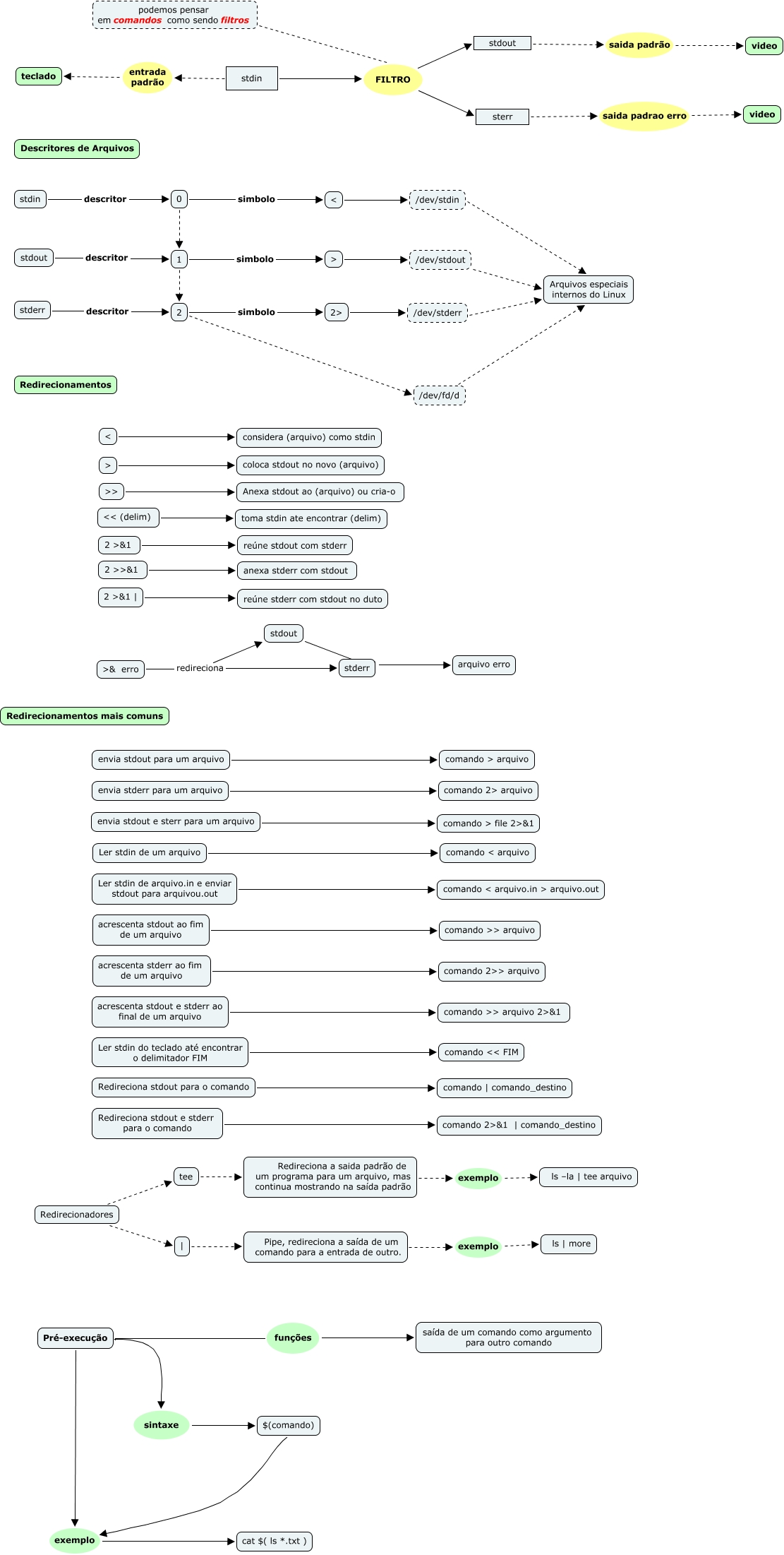 Esse mapa conceitual, produzido no IHMC CmapTools, tem a informação relacionada a: 04. Saidas Padrao, podemos pensar em comandos como sendo filtros FILTRO stdout, < considera (arquivo) como stdin, stdin FILTRO stdout, stderr descritor 2, > coloca stdout no novo (arquivo), Ler stdin do teclado até encontrar o delimitador FIM comando << FIM, Redireciona a saida padrão de um programa para um arquivo, mas continua mostrando na saída padrão exemplo ls –la | tee arquivo, $(comando) exemplo cat $( ls *.txt ), 2> /dev/stderr, /dev/fd/d Arquivos especiais internos do Linux, acrescenta stdout e stderr ao final de um arquivo comando >> arquivo 2>&1, Pré-execução exemplo cat $( ls *.txt ), 0 1, Redirecionadores |, tee Redireciona a saida padrão de um programa para um arquivo, mas continua mostrando na saída padrão, envia stderr para um arquivo comando 2> arquivo, 1 simbolo >, Pipe, redireciona a saída de um comando para a entrada de outro. exemplo ls | more, stdout descritor 1, Ler stdin de arquivo.in e enviar stdout para arquivou.out comando < arquivo.in > arquivo.out