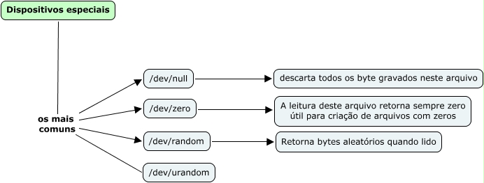 Esse mapa conceitual, produzido no IHMC CmapTools, tem a informação relacionada a: 03. Dispositivos Especiais, Dispositivos especiais os mais comuns /dev/random, Dispositivos especiais os mais comuns /dev/zero, /dev/null descarta todos os byte gravados neste arquivo, /dev/random Retorna bytes aleatórios quando lido, /dev/zero A leitura deste arquivo retorna sempre zero útil para criação de arquivos com zeros, Dispositivos especiais os mais comuns /dev/urandom, Dispositivos especiais os mais comuns /dev/null