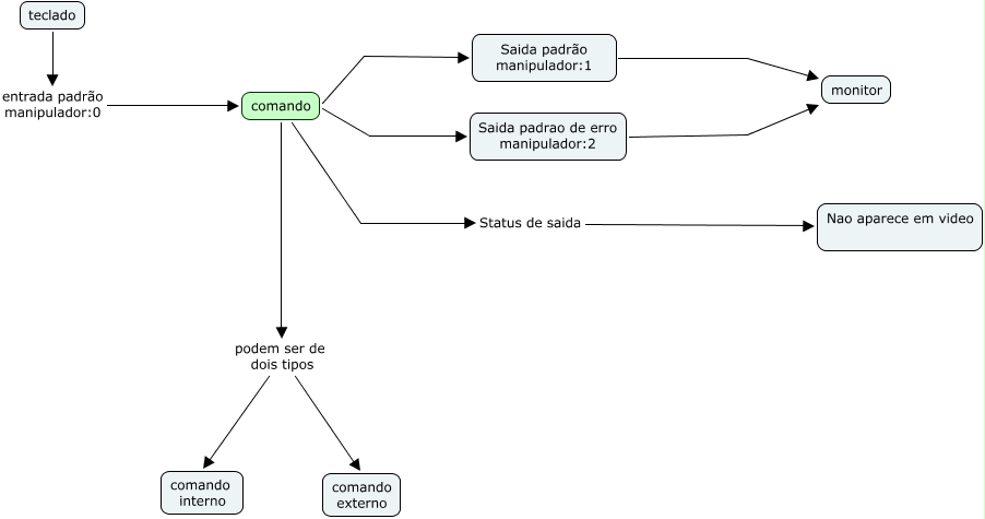 Esse mapa conceitual, produzido no IHMC CmapTools, tem a informação relacionada a: 02. Comandos no Linux, Saida padrão manipulador:1 monitor, comando Saida padrao de erro manipulador:2, teclado entrada padrão manipulador:0 comando, comando podem ser de dois tipos comando interno, comando Saida padrão manipulador:1, Saida padrao de erro manipulador:2 monitor, comando podem ser de dois tipos comando externo, comando Status de saida Nao aparece em video