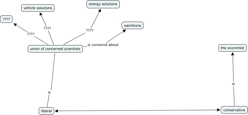 This Concept Map, created with IHMC CmapTools, has information related to: resourses, conservative is the econimist, union of concerned scientists ???? vehicle solutions, liberal conservative, union of concerned scientists ???? ????, union of concerned scientists is liberal, union of concerned scientists ???? energy solutions, union of concerned scientists is concernd about eamitions