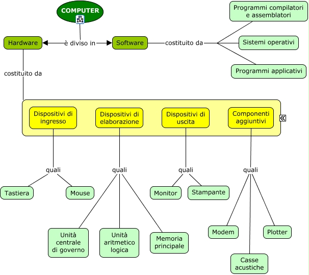 Questa Cmap, creata con IHMC CmapTools, contiene informazioni relative a: Il computer, Dispositivi di elaborazione quali Unità aritmetico logica, COMPUTER è diviso in Hardware, Dispositivi di elaborazione quali Unità centrale di governo, Componenti aggiuntivi quali Modem, COMPUTER è diviso in Software, Componenti aggiuntivi quali Plotter, Hardware costituito da Componenti hardware, Dispositivi di uscita quali Stampante, Dispositivi di elaborazione quali Memoria principale, Sistemi operativi costituito da Programmi compilatori e assemblatori, Componenti aggiuntivi quali Casse acustiche, Dispositivi di ingresso quali Tastiera, Software costituito da Programmi compilatori e assemblatori, Dispositivi di ingresso quali Mouse, Programmi applicativi costituito da Programmi compilatori e assemblatori, Dispositivi di uscita quali Monitor