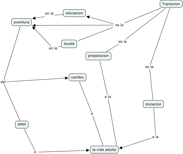 Este Cmap, tiene información relacionada con: transicion(gonzalo y naxo), iniciacion a la la vida adulta, Transicion es la educacion, cambio a la vida adulta, aventura del cambio, paso a la vida adulta, Transicion es la ayuda, Transicion es la preparacion, Transicion es la aventura, ayuda en la aventura, Transicion es la iniciacion, preparacion a la la vida adulta, educacion en la aventura, aventura del paso