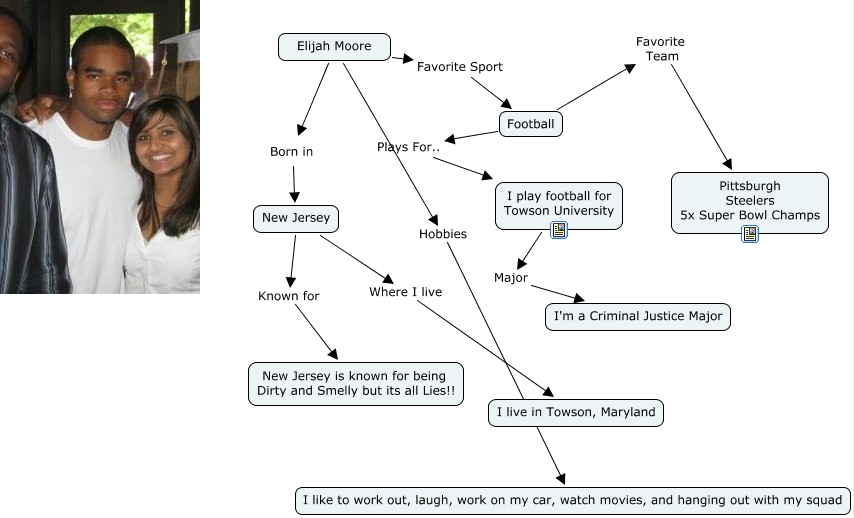 This Concept Map, created with IHMC CmapTools, has information related to: elijahs concept map, Football Plays For.. I play football for Towson University, Elijah Moore Born in New Jersey, New Jersey Where I live I live in Towson, Maryland, New Jersey Known for New Jersey is known for being Dirty and Smelly but its all Lies!!, I play football for Towson University Major I'm a Criminal Justice Major, Elijah Moore Favorite Sport Football, Elijah Moore Hobbies I like to work out, laugh, work on my car, watch movies, and hanging out with my squad, Football Favorite Team Pittsburgh Steelers 5x Super Bowl Champs