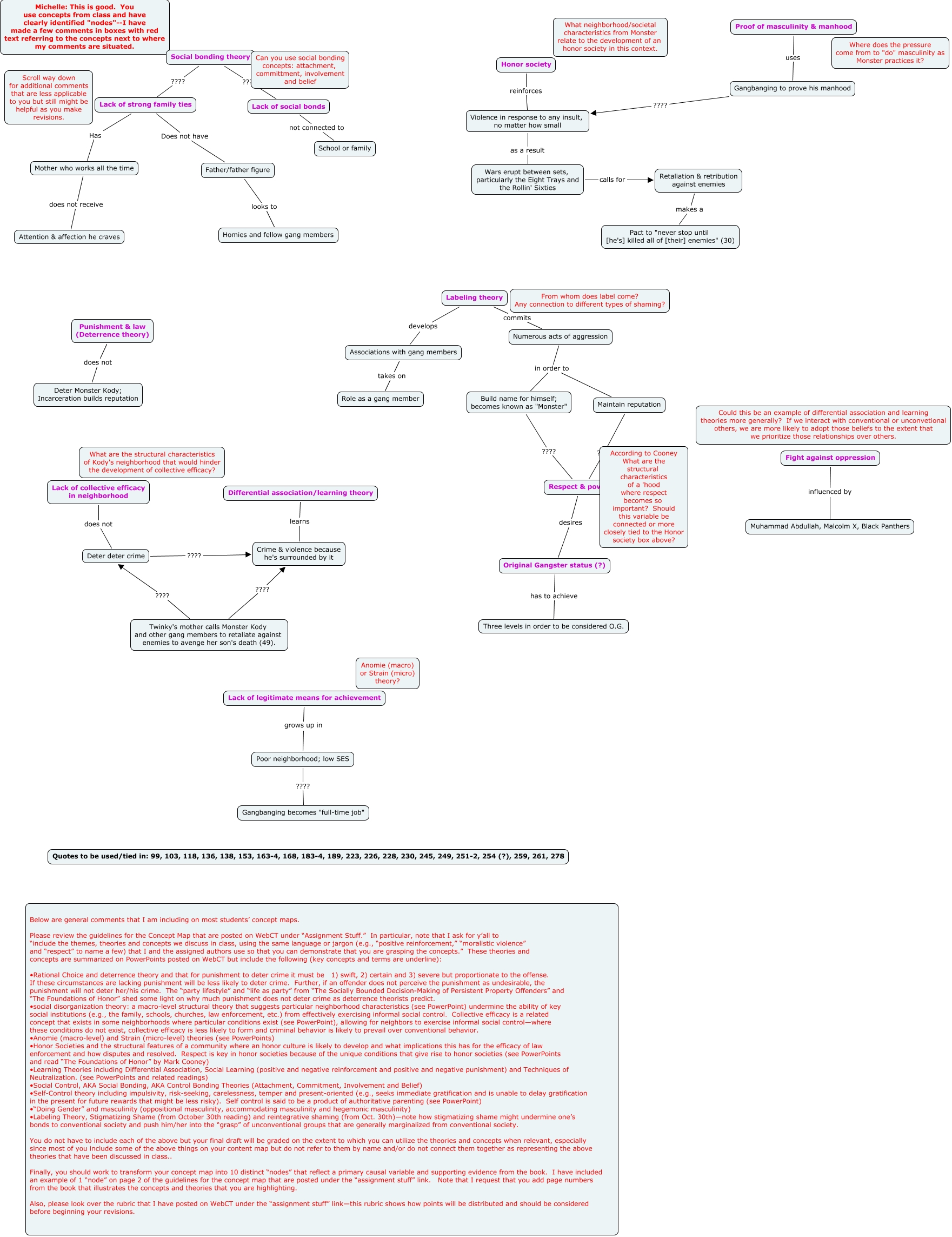 This Concept Map, created with IHMC CmapTools, has information related to: Monster, Lack of strong family ties Does not have Father/father figure, Twinky's mother calls Monster Kody and other gang members to retaliate against enemies to avenge her son's death (49). ???? Deter deter crime, Numerous acts of aggression in order to Maintain reputation, Twinky's mother calls Monster Kody and other gang members to retaliate against enemies to avenge her son's death (49). ???? Crime & violence because he's surrounded by it, Punishment & law (Deterrence theory) does not Deter Monster Kody; Incarceration builds reputation, Lack of strong family ties Has Mother who works all the time, Poor neighborhood; low SES ???? Gangbanging becomes "full-time job", Wars erupt between sets, particularly the Eight Trays and the Rollin' Sixties calls for Retaliation & retribution against enemies, Numerous acts of aggression in order to Build name for himself; becomes known as "Monster", Build name for himself; becomes known as "Monster" ???? Respect & power, Gangbanging to prove his manhood ???? Violence in response to any insult, no matter how small, Retaliation & retribution against enemies makes a Pact to "never stop until [he's] killed all of [their] enemies" (30), Maintain reputation ???? Respect & power, Labeling theory commits Numerous acts of aggression, Differential association/learning theory learns Crime & violence because he's surrounded by it, Deter deter crime ???? Crime & violence because he's surrounded by it, Original Gangster status (?) has to achieve Three levels in order to be considered O.G., Father/father figure looks to Homies and fellow gang members, Fight against oppression influenced by Muhammad Abdullah, Malcolm X, Black Panthers, Respect & power desires Original Gangster status (?)
