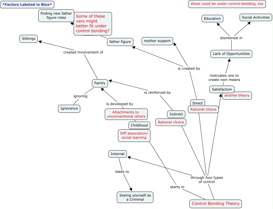 This Concept Map, created with IHMC CmapTools, has information related to: Monster 3, father figure absence of results in finding new father figure roles, Control Bonding Theory through four types of control Direct, Indirect is reinforced by Family, Direct is created by mother support, Satisfaction motivates one to create own means Lack of Opportunities, Control Bonding Theory through four types of control Indirect, Lack of Opportunities disinterest in Education, Lack of Opportunities disinterest in Social Acitivities, Control Bonding Theory through four types of control Satisfaction, Direct is created by father figure, Control Bonding Theory through four types of control Internal, Control Bonding Theory starts in Childhood, Family ignoring Ignorance, Family created involvement of Siblings, Childhood is developed by Family, Internal leads to Seeing yourself as a Criminal