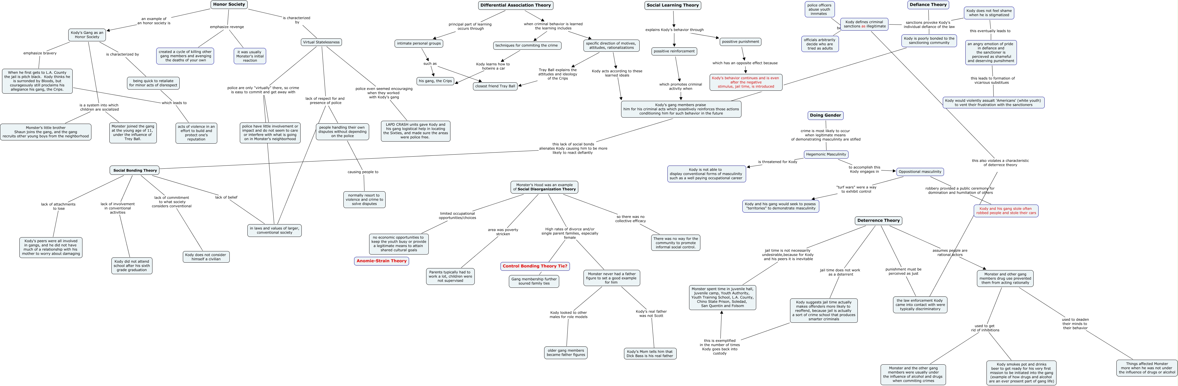 This Concept Map, created with IHMC CmapTools, has information related to: Final Draft Monster CMap, Kody defines criminal sanctions as illegitimate because officials arbitrarily decide who are tried as adults, Monster's Hood was an example of Social Disorganization Theory limited occupational opportunities/choices no economic opportunities to keep the youth busy or provide a legitimate means to attain shared cultural goals, Social Bonding Theory lack of involvement in conventional activities Kody did not attend school after his sixth grade graduation, Monster and other gang members drug use prevented them from acting rationally used to get rid of inhibitions Kody smokes pot and drinks beer to get ready for his very first mission to be initiated into the gang (example of how drugs and alcohol are an ever present part of gang life), possitive reinforcement which promotes criminal activity when Kody's gang members praise him for his criminal acts which possitively reinforces those actions conditioning him for such behavior in the future, Kody is poorly bonded to the sanctioning community this lack of social bonds alienates Kody causing him to be more likely to react defiantly ????, Monster and other gang members drug use prevented them from acting rationally used to deaden their minds to their behavior Things affected Monster more when he was not under the influence of drugs or alcohol, When he first gets to L.A. County the jail is pitch black. Kody thinks he is surronded by Bloods, but courageously still proclaims his allegiance his gang, the Crips. which leads to acts of violence in an effort to build and protect one's reputation, Defiance Theory sanctions provoke Kody's individual defiance of the law Kody defines criminal sanctions as illegitimate, Kody's Gang as an Honor Society emphasize bravery When he first gets to L.A. County the jail is pitch black. Kody thinks he is surronded by Bloods, but courageously still proclaims his allegiance his gang, the Crips., Social Learning Theory explains Kody's behavior through possitive punishment, an angry emotion of pride in defiance and the sanctioner is percieved as shameful and deserving punsihment this leads to formation of vicarious substitues Kody would violently assualt 'Americans' (white youth) to vent their frustration with the sanctioners, intimate personal groups such as his gang, the Crips, Oppositional masculinity robbery provided a public ceremony for domination and humiliation of others Kody and his gang stole often robbed people and stole their cars, Social Bonding Theory lack of attachments to lose Kody's peers were all involved in gangs, and he did not have much of a relationship with his mother to worry about damaging, Social Learning Theory explains Kody's behavior through possitive reinforcement, possitive punishment which has an opposite effect because Kody's behavior continues and is even after the negative stimulus, jail time, is introduced, Honor Society emphasize revenge it was usually Monster's initial reaction, Hegemonic Masculinity to accomplish this Kody engages in Oppositional masculinity, in laws and values of larger, conventional society police are only "virtually" there, so crime is easy to commit and get away with police have little involvement or impact and do not seem to care or interfere with what is going on in Monster's neighborhood