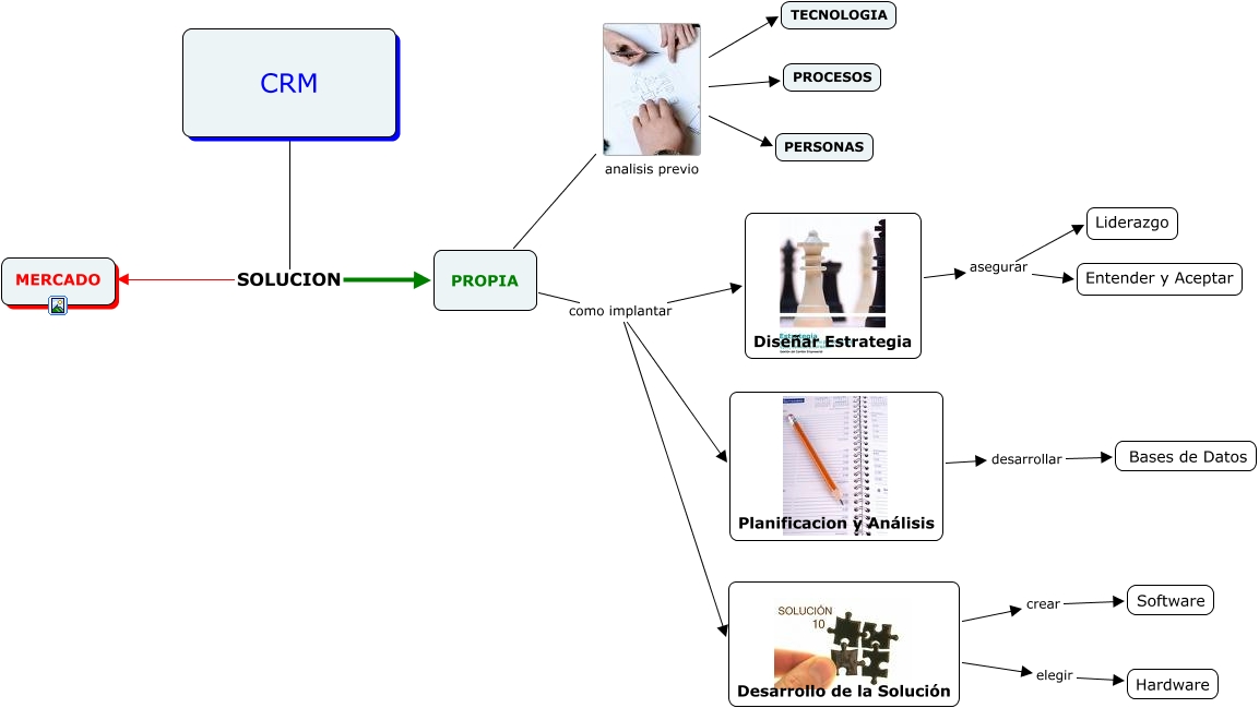 Este Cmap, tiene información relacionada con: SOLUCION, CRM SOLUCION PROPIA, Desarrollo de la Solución elegir Hardware, CRM SOLUCION MERCADO, Diseñar Estrategia asegurar Liderazgo, Diseñar Estrategia asegurar Entender y Aceptar, PROPIA como implantar Desarrollo de la Solución, PROPIA analisis previo PROCESOS, PROPIA analisis previo TECNOLOGIA, PROPIA como implantar Diseñar Estrategia, PROPIA analisis previo PERSONAS, PROPIA como implantar Planificacion y Análisis, Planificacion y Análisis desarrollar Bases de Datos, Desarrollo de la Solución crear Software