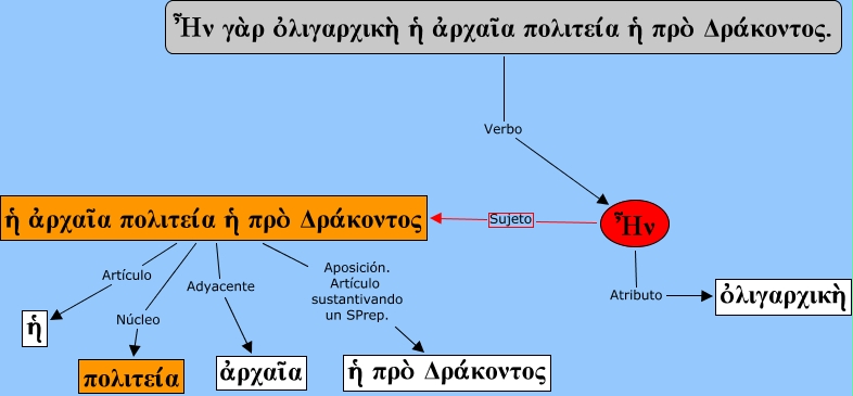 Este Cmap, tiene información relacionada con: 1ª Frase Sintaxis Sintagmas. Colegio Aljarafe, ἡ ἀρχαῖα πολιτεία ἡ πρὸ Δράκοντος Aposición. Artículo sustantivando un SPrep. ἡ πρὸ Δράκοντος, Ἦν Sujeto ἡ ἀρχαῖα πολιτεία ἡ πρὸ Δράκοντος, Ἦν Atributo ὀλιγαρχικὴ, ἡ ἀρχαῖα πολιτεία ἡ πρὸ Δράκοντος Artículo ἡ, Ἦν γὰρ ὀλιγαρχικὴ ἡ ἀρχαῖα πολιτεία ἡ πρὸ Δράκοντος. Verbo Ἦν, ἡ ἀρχαῖα πολιτεία ἡ πρὸ Δράκοντος Núcleo πολιτεία, ἡ ἀρχαῖα πολιτεία ἡ πρὸ Δράκοντος Adyacente ἀρχαῖα