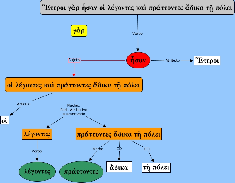 Este Cmap, tiene información relacionada con: 4ª Frase Sintaxis Sintagmas. Colegio Aljarafe, οἱ λέγοντες καì πράττοντες ἄδικα τῇ πόλει Núcleo. Part. Atributivo sustantivado πράττοντες ἄδικα τῇ πόλει, οἱ λέγοντες καì πράττοντες ἄδικα τῇ πόλει Núcleo. Part. Atributivo sustantivado λέγοντες, λέγοντες Verbo λέγοντες, πράττοντες ἄδικα τῇ πόλει CCL τῇ πόλει, πράττοντες ἄδικα τῇ πόλει CD ἄδικα, Ἓτεροι γὰρ ἦσαν οἱ λέγοντες καì πράττοντες ἄδικα τῇ πόλει Verbo ἦσαν, πράττοντες ἄδικα τῇ πόλει Verbo πράττοντες, οἱ λέγοντες καì πράττοντες ἄδικα τῇ πόλει Artículo οἱ, ἦσαν Sujeto οἱ λέγοντες καì πράττοντες ἄδικα τῇ πόλει, ἦσαν Atributo Ἓτεροι