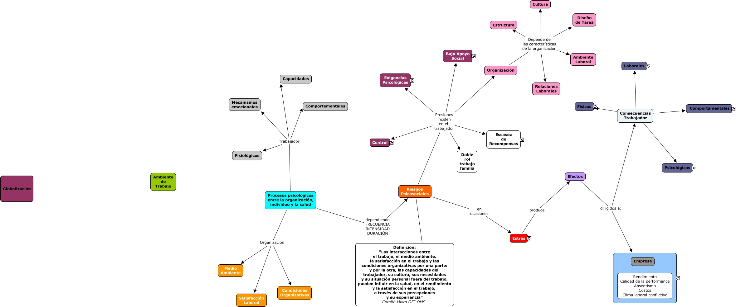 Este Cmap, tiene información relacionada con: Mapa conceptual Factores Psicosociales, Estrés produce Efectos, Organización Depende de las características de la organización Ambiente Laboral, Riesgos Psicosociales en ocasiones Estrés, Riesgos Psicosociales ???? Definición: "Las interacciones entre el trabajo, el medio ambiente, la satisfacción en el trabajo y las condiciones organizativas por una parte: y por la otra, las capacidades del trabajador, su cultura, sus necesidades y su situación personal fuera del trabajo, pueden influir en la salud, en el rendimiento y la satisfacción en el trabajo, a través de sus percepciones y su experiencia" Comité Mixto OIT-OMS, Consecuencias Trabajador Consecuencias Trabajador Psicológicas, Procesos psicológicos entre la organización, individuo y la salud Organización Medio Ambiente, Organización Depende de las características de la organización Relaciones Laborales, Riesgos Psicosociales Presiones inciden en el trabajador Escasez de Recompensas, Riesgos Psicosociales Presiones inciden en el trabajador Doble rol trabajo familia, Procesos psicológicos entre la organización, individuo y la salud Trabajador Comportamentales, Riesgos Psicosociales Presiones inciden en el trabajador Exigencias Psicológicas, Efectos dirigidos a: Consecuencias Trabajador, Efectos dirigidos a: Consecuencias Empresa, Organización Depende de las características de la organización Estructura, Consecuencias Trabajador Consecuencias Trabajador Físicas, Consecuencias Trabajador Consecuencias Trabajador Comportamentales, Procesos psicológicos entre la organización, individuo y la salud Organización Satisfacción Laboral, Organización Depende de las características de la organización Cultura, Procesos psicológicos entre la organización, individuo y la salud Trabajador Fisiológicos, Organización Depende de las características de la organización Diseño de Tarea