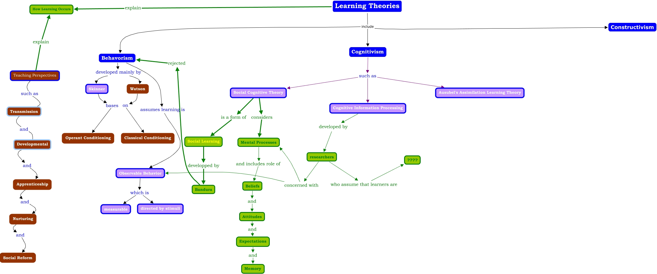 This Concept Map, created with IHMC CmapTools, has information related to: Draft3, Transmission and Developmental, Mental Processes and includes role of Beliefs, Cognitive Information Processing developed by researchers, researchers who assume that learners are ????, Teaching Perspectives such as Transmission, Learning Theories include Constructivism, Behavorism developed mainly by Watson, Expectations and Memory, Learning Theories include Behavorism, Cognitivism such as Social Cognitive Theory, Watson on Classical Conditioning, Cognitivism such as Ausubel's Assimilation Learning Theory, Developmental and Apprenticeship, Cognitivism such as Cognitive Information Processing, Apprenticeship and Nurturing, Learning Theories include Cognitivism, Observable Behavior which is measurable, Nurturing and Social Reform, Beliefs and Attitudes, Behavorism developed mainly by Skinner