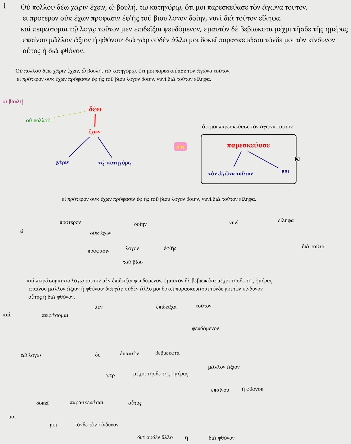 Este Cmap, tiene información relacionada con: frag.1, ἔχειν ???? δέω, μοι παρεσκεύασε, μοι ???? παρεσκεύασε, τῷ κατηγόρῳ ???? ἔχειν, τὸν ἀγῶνα τοῦτον ???? παρεσκεύασε, οὐ πολλοῦ ???? δέω, ὅτι ???? ἔχειν, χάριν ???? ἔχειν, ὅτι ???? παρεσκεύασε