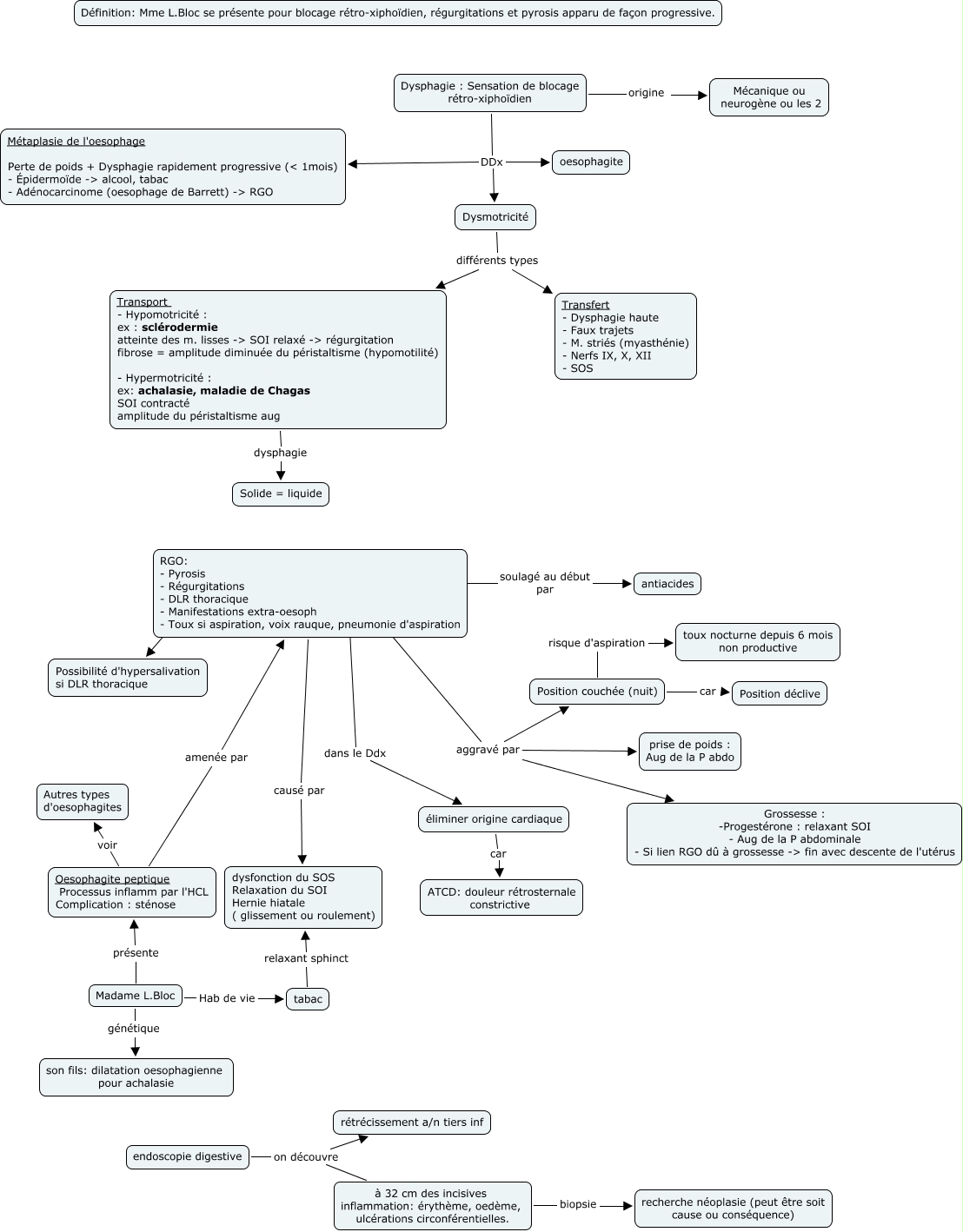 Cette carte conceptuelle, cree avec IHMC CmapTools, contient des informations liees a : APP1-retour, endoscopie digestive on découvre rétrécissement a/n tiers inf, Dysphagie : Sensation de blocage rétro-xiphoïdien DDx oesophagite, Dysphagie : Sensation de blocage rétro-xiphoïdien DDx Métaplasie de l'oesophage Perte de poids + Dysphagie rapidement progressive (< 1mois) - Épidermoïde -> alcool, tabac - Adénocarcinome (oesophage de Barrett) -> RGO, endoscopie digestive on découvre à 32 cm des incisives inflammation: érythème, oedème, ulcérations circonférentielles., éliminer origine cardiaque car ATCD: douleur rétrosternale constrictive, Oesophagite peptique Processus inflamm par l'HCL Complication : sténose voir Autres types d'oesophagites, pyrosis soulagé au début par antiacides, pyrosis aggravé par prise de poids : Aug de la P abdo, Madame L.Bloc génétique son fils: dilatation oesophagienne pour achalasie, Transport - Hypomotricité : ex : sclérodermie atteinte des m. lisses -> SOI relaxé -> régurgitation fibrose = amplitude diminuée du péristaltisme (hypomotilité) - Hypermotricité : ex: achalasie, maladie de Chagas SOI contracté amplitude du péristaltisme aug dysphagie Solide = liquide, Dysmotricité différents types Transport - Hypomotricité : ex : sclérodermie atteinte des m. lisses -> SOI relaxé -> régurgitation fibrose = amplitude diminuée du péristaltisme (hypomotilité) - Hypermotricité : ex: achalasie, maladie de Chagas SOI contracté amplitude du péristaltisme aug, Dysphagie : Sensation de blocage rétro-xiphoïdien DDx Dysmotricité, pyrosis dans le Ddx éliminer origine cardiaque, RGO: - Pyrosis - Régurgitations - DLR thoracique - Manifestations extra-oesoph - Toux si aspiration, voix rauque, pneumonie d'aspiration ???? Possibilité d'hypersalivation si DLR thoracique, Madame L.Bloc présente Oesophagite peptique Processus inflamm par l'HCL Complication : sténose, tabac relaxant sphinct dysfonction du SOS Relaxation du SOI Hernie hiatale ( glissement ou roulement), Position couchée (nuit) car Position déclive, pyrosis aggravé par Grossesse : -Progestérone : relaxant SOI - Aug de la P abdominale - Si lien RGO dû à grossesse -> fin avec descente de l'utérus, Dysphagie : Sensation de blocage rétro-xiphoïdien origine Mécanique ou neurogène ou les 2, à 32 cm des incisives inflammation: érythème, oedème, ulcérations circonférentielles. biopsie recherche néoplasie (peut être soit cause ou conséquence)