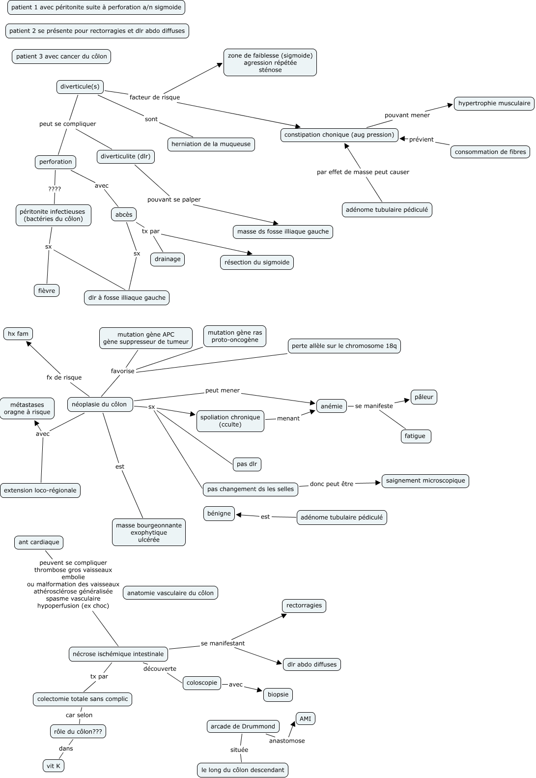 Cette carte conceptuelle, cree avec IHMC CmapTools, contient des informations liees a : APP 3 - Aller, néoplasie du côlon est masse bourgeonnante exophytique ulcérée, consommation de fibres prévient constipation chonique (aug pression), arcade de Drummond anastomose AMI, diverticulite (dlr) pouvant se palper masse ds fosse illiaque gauche, nécrose ischémique intestinale se manifestant dlr abdo diffuses, rôle du côlon??? dans vit K, diverticule(s) peut se compliquer perforation, anémie se manifeste pâleur, néoplasie du côlon avec métastases oragne à risque, néoplasie du côlon sx pas dlr, néoplasie du côlon sx spoliation chronique (cculte), mutation gène ras proto-oncogène favorise néoplasie du côlon, néoplasie du côlon peut mener anémie, constipation chonique (aug pression) pouvant mener hypertrophie musculaire, perforation avec abcès, ant cardiaque peuvent se compliquer thrombose gros vaisseaux embolie ou malformation des vaisseaux athérosclérose généralisée spasme vasculaire hypoperfusion (ex choc) nécrose ischémique intestinale, nécrose ischémique intestinale se manifestant rectorragies, spoliation chronique (cculte) menant anémie, adénome tubulaire pédiculé est bénigne, abcès tx par drainage