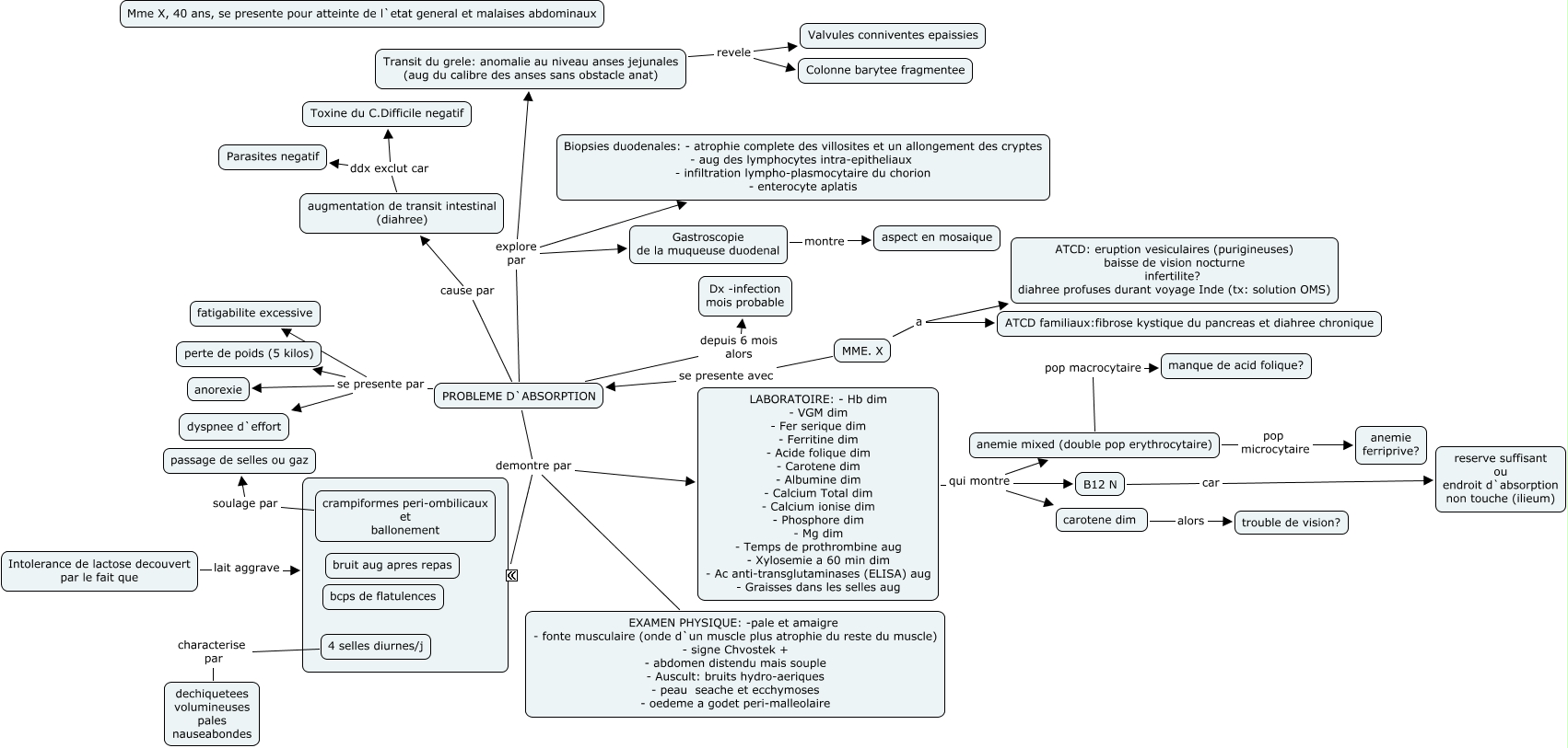 Cette carte conceptuelle, cree avec IHMC CmapTools, contient des informations liees a : App4-Aller, MME. X a ATCD familiaux:fibrose kystique du pancreas et diahree chronique, PROBLEME D`ABSORPTION demontre par ????, LABORATOIRE: - Hb dim - VGM dim - Fer serique dim - Ferritine dim - Acide folique dim - Carotene dim - Albumine dim - Calcium Total dim - Calcium ionise dim - Phosphore dim - Mg dim - Temps de prothrombine aug - Xylosemie a 60 min dim - Ac anti-transglutaminases (ELISA) aug - Graisses dans les selles aug qui montre B12 N, PROBLEME D`ABSORPTION demontre par LABORATOIRE: - Hb dim - VGM dim - Fer serique dim - Ferritine dim - Acide folique dim - Carotene dim - Albumine dim - Calcium Total dim - Calcium ionise dim - Phosphore dim - Mg dim - Temps de prothrombine aug - Xylosemie a 60 min dim - Ac anti-transglutaminases (ELISA) aug - Graisses dans les selles aug, B12 N car reserve suffisant ou endroit d`absorption non touche (ilieum), augmentation de transit intestinal (diahree) ddx exclut car Toxine du C.Difficile negatif, PROBLEME D`ABSORPTION explore par Transit du grele: anomalie au niveau anses jejunales (aug du calibre des anses sans obstacle anat), PROBLEME D`ABSORPTION explore par Gastroscopie de la muqueuse duodenal, Intolerance de lactose decouvert par le fait que lait aggrave ????, Transit du grele: anomalie au niveau anses jejunales (aug du calibre des anses sans obstacle anat) revele Valvules conniventes epaissies, anemie mixed (double pop erythrocytaire) pop microcytaire anemie ferriprive?, anemie mixed (double pop erythrocytaire) pop macrocytaire manque de acid folique?, PROBLEME D`ABSORPTION se presente par anorexie, carotene dim alors trouble de vision?, LABORATOIRE: - Hb dim - VGM dim - Fer serique dim - Ferritine dim - Acide folique dim - Carotene dim - Albumine dim - Calcium Total dim - Calcium ionise dim - Phosphore dim - Mg dim - Temps de prothrombine aug - Xylosemie a 60 min dim - Ac anti-transglutaminases (ELISA) aug - Graisses dans les selles aug qui montre carotene dim, MME. X se presente avec PROBLEME D`ABSORPTION, augmentation de transit intestinal (diahree) ddx exclut car Parasites negatif, PROBLEME D`ABSORPTION se presente par perte de poids (5 kilos), PROBLEME D`ABSORPTION se presente par fatigabilite excessive, PROBLEME D`ABSORPTION explore par Biopsies duodenales: - atrophie complete des villosites et un allongement des cryptes - aug des lymphocytes intra-epitheliaux - infiltration lympho-plasmocytaire du chorion - enterocyte aplatis
