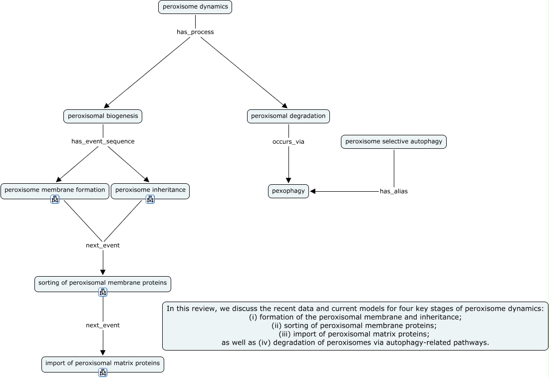 This Concept Map, created with IHMC CmapTools, has information related to: Peroxisome dynamics 01b, peroxisomal biogenesis has_event_sequence peroxisome inheritance, peroxisomal biogenesis has_event_sequence peroxisome membrane formation, peroxisomal degradation occurs_via pexophagy, peroxisome dynamics has_process peroxisomal biogenesis, peroxisome selective autophagy has_alias pexophagy, peroxisome inheritance next_event sorting of peroxisomal membrane proteins, peroxisome dynamics has_process peroxisomal degradation, sorting of peroxisomal membrane proteins next_event import of peroxisomal matrix proteins, peroxisome membrane formation next_event sorting of peroxisomal membrane proteins