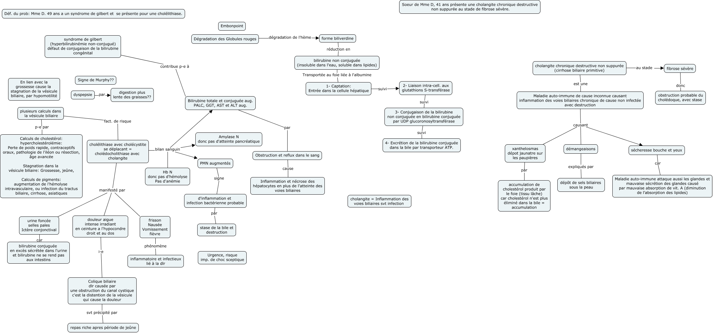 Cette carte de concepts créée avec IHMC CmapTools traite de: app 6 retour, cholélithiase avec cholécystite se déplacant = cholédocholithiase avec cholangite bilan sanguin Bilirubine totale et conjuguée aug. PALC, GGT, AST et ALT aug., Maladie auto-immune de cause inconnue causant inflammation des voies biliaires chronique de cause non infectée avec destruction causant xanthelosmas dépot jaunatre sur les paupières, cholélithiase avec cholécystite se déplacant = cholédocholithiase avec cholangite bilan sanguin Hb N donc pas d'hémolyse Pas d'anémie, frisson Nausée Vomissement fièvre phénomène inflammatoire et infectieux lié à la dlr, sécheresse bouche et yeux car Maladie auto-immune attaque aussi les glandes et mauvaise sécrétion des glandes causé par mauvaise absorption de vit. A (diminution de l'absorption des lipides), Obstruction et reflux dans le sang cause Inflammation et nécrose des hépatocytes en plus de l'atteinte des voies biliaires, cholélithiase avec cholécystite se déplacant = cholédocholithiase avec cholangite manifesté par urine foncée selles pales Ictère conjonctival, 1- Captation: Entrée dans la cellule hépatique suivi 2- Liaison intra-cell. aux glutathions S-transférase, Colique biliaire dlr causée par une obstruction du canal cystique c'est la distention de la vésicule qui cause la douleur svt précipité par repas riche apres période de jeûne, plusieurs calculs dans la vésicule biliaire fact. de risque cholélithiase avec cholécystite se déplacant = cholédocholithiase avec cholangite, xanthelosmas dépot jaunatre sur les paupières par accumulation de cholestérol produit par le foie (tissu lâche) car cholestérol n'est plus éliminé dans la bile = accumulation, démangeaisons expliqués par dépôt de sels biliaires sous la peau, PMN augmentés signe d'inflammation et infection bactérienne probable, plusieurs calculs dans la vésicule biliaire p-e par Calculs de cholestérol: hypercholestérolémie: Perte de poids rapide, contraceptifs oraux, pathologie de l'iléon ou résection, âge avancée Stagnation dans la vésicule biliaire: Grossesse, jeûne, Calculs de pigments: augmentation de l'hémolyse intravasculaire, ou infection du tractus biliaire, cirrhose, asiatiques, 3- Conjugaison de la bilirubine non conjuguée en bilirubine conjuguée par UDP glucoronosyltransférase suivi 4- Excrétion de la bilirubine conjuguée dans la bile par transporteur ATP., syndrome de gilbert (hyperbilirubinémie non-conjugué) défaut de conjugaison de la bilirubine congénital contribue p-e à Bilirubine totale et conjuguée aug. PALC, GGT, AST et ALT aug., Dégradation des Globules rouges dégradation de l'hème forme biliverdine, cholélithiase avec cholécystite se déplacant = cholédocholithiase avec cholangite manifesté par frisson Nausée Vomissement fièvre, d'inflammation et infection bactérienne probable par stase de la bile et destruction, cholangite chronique destructive non suppurée (cirrhose biliaire primitive) est une Maladie auto-immune de cause inconnue causant inflammation des voies biliaires chronique de cause non infectée avec destruction