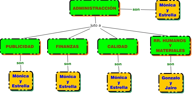 Este Cmap, tiene información relacionada con: DepartamentosEmpresa3D, ADMINISTRACCIÓN juto a PUBLICIDAD, RR. HUMANOS Y MATERIALES son Gonzalo y Jairo, ADMINISTRACCIÓN son Mónica y Estrella, FINANZAS son Mónica y Estrella, ADMINISTRACCIÓN juto a RR. HUMANOS Y MATERIALES, ADMINISTRACCIÓN juto a FINANZAS, ADMINISTRACCIÓN juto a CALIDAD, PUBLICIDAD son Mónica y Estrella, CALIDAD son Mónica y Estrella
