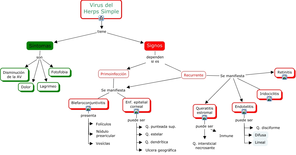 Este Cmap, tiene información relacionada con: Signos y síntomas, Virus del Herps Simple tiene Signos, Síntomas son Dolor, Enf. epitelial corneal puede ser Ulcera geográfica, Enf. epitelial corneal puede ser Q. punteada sup., Blefaroconjuntivitis presenta Vesíclas, Enf. epitelial corneal puede ser Q. dendrítica, Síntomas son Disminución de la AV, Virus del Herps Simple tiene Síntomas, Endotelitis puede ser Q. disciforme, Queratitis estromal puede ser Q. intersticial necrosante, Endotelitis puede ser Difusa, Recurrente Se manifiesta Iridociclitis, Queratitis estromal puede ser Inmune, Recurrente Se manifiesta Endotelitis, Signos dependen si es Primoinfección, Síntomas son Lagrimeo, Recurrente Se manifiesta Enf. epitelial corneal, Recurrente Se manifiesta Retinitis, Recurrente Se manifiesta Queratitis estromal, Primoinfección Se manifiesta Enf. epitelial corneal