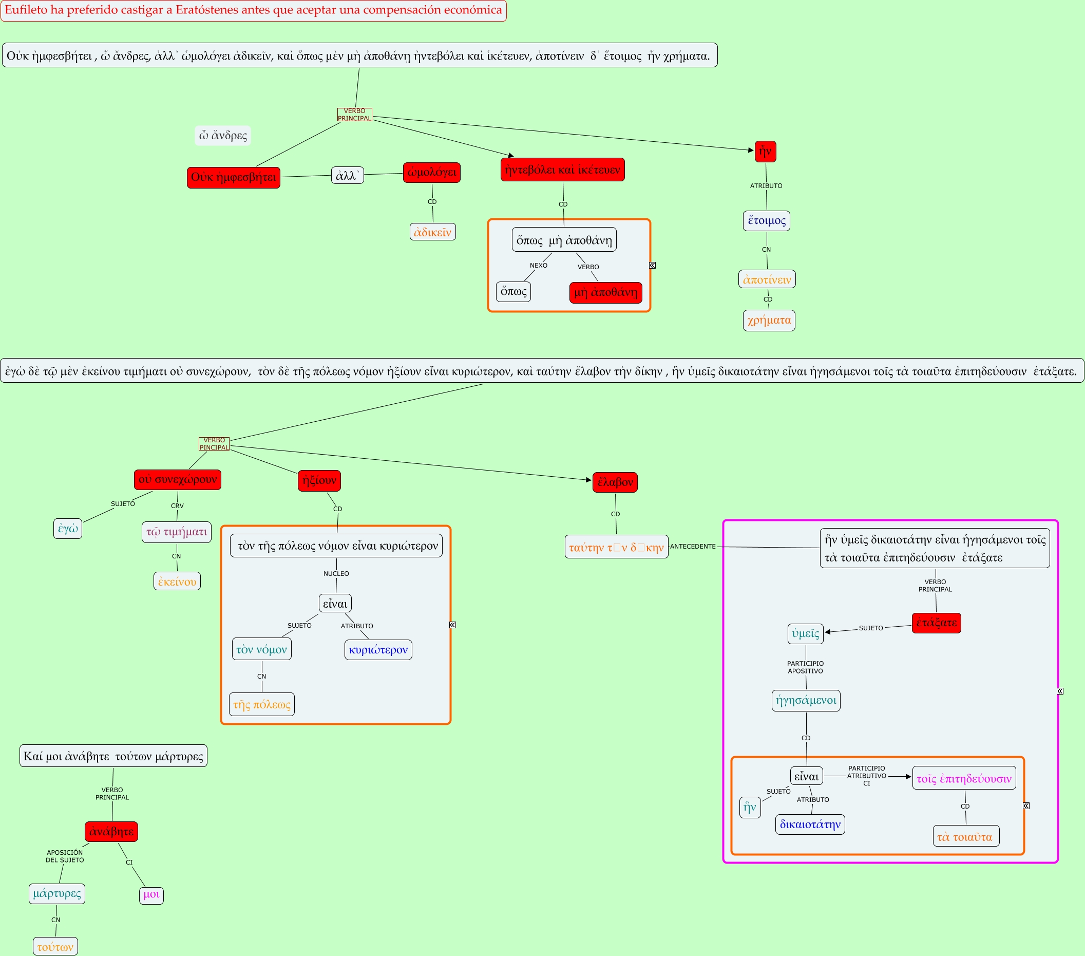 Este Cmap, tiene información relacionada con: Lisias I, 29_1020_21_01, εἶναι SUJETO τὸν νόμον, ἐτάξατε SUJETO ὑμεῖς, ἡγησάμενοι CD εἶναι, εἶναι ATRIBUTO κυριώτερον, τὸν τῆς πόλεως νόμον εἶναι κυριώτερον NUCLEO εἶναι, τοῖς ἐπιτηδεύουσιν CD τὰ τοιαῦτα, ἐγὼ δὲ τῷ μὲν ἐκείνου τιμήματι οὐ συνεχώρουν, τὸν δὲ τῆς πόλεως νόμον ἠξίουν εἶναι κυριώτερον, καὶ ταύτην ἔλαβον τὴν δίκην , ἣν ὑμεῖς δικαιοτάτην εἶναι ἡγησάμενοι τοῖς τὰ τοιαῦτα ἐπιτηδεύουσιν ἐτάξατε. VERBO PINCIPAL οὐ συνεχώρουν, ὡμολόγει F ἀλλ᾿, ἣν ὑμεῖς δικαιοτάτην εἶναι ἡγησάμενοι τοῖς τὰ τοιαῦτα ἐπιτηδεύουσιν ἐτάξατε VERBO PRINCIPAL ἐτάξατε, τὸν νόμον CN τῆς πόλεως, εἶναι PARTICIPIO ATRIBUTIVO CI τοῖς ἐπιτηδεύουσιν, ἠντεβόλει καὶ ἱκέτευεν CD ὅπως μὴ ἀποθάνῃ, ἔλαβον CD ταύτην τὴν δίκην, ἐγὼ δὲ τῷ μὲν ἐκείνου τιμήματι οὐ συνεχώρουν, τὸν δὲ τῆς πόλεως νόμον ἠξίουν εἶναι κυριώτερον, καὶ ταύτην ἔλαβον τὴν δίκην , ἣν ὑμεῖς δικαιοτάτην εἶναι ἡγησάμενοι τοῖς τὰ τοιαῦτα ἐπιτηδεύουσιν ἐτάξατε. VERBO PINCIPAL ἠξίουν, ἀποτίνειν CD χρήματα, ἦν ATRIBUTO ἕτοιμος, οὐ συνεχώρουν CRV τῷ τιμήματι, Οὐκ ἠμφεσβήτει ???? ἀλλ᾿, ἀνάβητε CI μοι, ὅπως μὴ ἀποθάνῃ VERBO μὴ ἀποθάνῃ