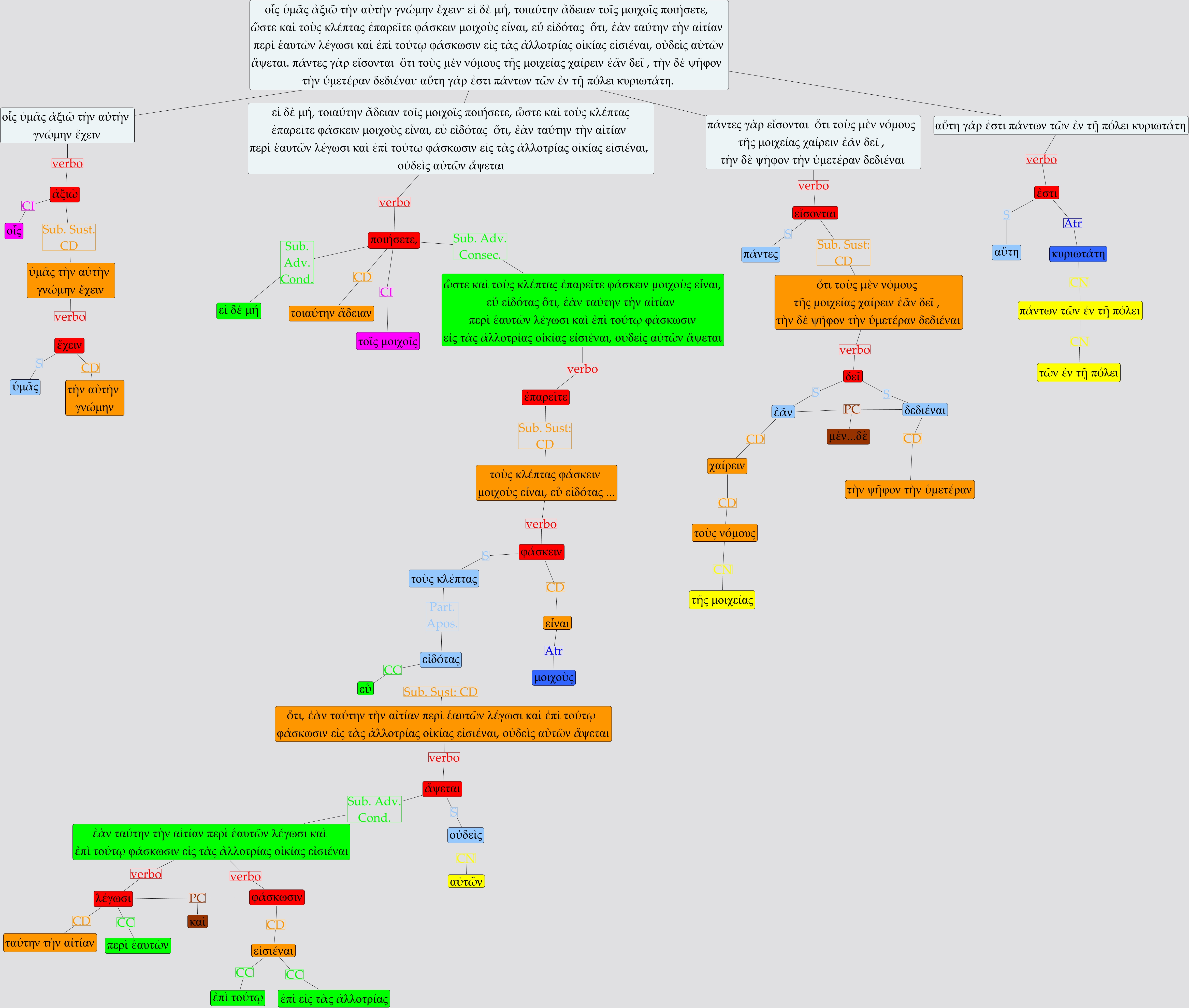 Este Cmap, tiene información relacionada con: Lisias I, 36_2000_19_01, ἐστι Atr κυριωτάτη, τοὺς κλέπτας φάσκειν μοιχοὺς εἶναι, εὖ εἰδότας ... verbo φάσκειν, οἷς ὑμᾶς ἀξιῶ τὴν αὐτὴν γνώμην ἔχειν verbo ἀξιῶ, δεῖ S ἐᾶν, ἐστι S αὕτη, εἶναι Atr μοιχοὺς, κυριωτάτη CN πάντων τῶν ἐν τῇ πόλει, ἐὰν ταύτην τὴν αἰτίαν περὶ ἑαυτῶν λέγωσι καὶ ἐπὶ τούτῳ φάσκωσιν εἰς τὰς ἀλλοτρίας οἰκίας εἰσιέναι verbo λέγωσι, ἀξιῶ Sub. Sust. CD ὑμᾶς τὴν αὐτὴν γνώμην ἔχειν, φάσκωσιν PC λέγωσι, ὅτι τοὺς μὲν νόμους τῆς μοιχείας χαίρειν ἐᾶν δεῖ , τὴν δὲ ψῆφον τὴν ὑμετέραν δεδιέναι verbo δεῖ, ἐπαρεῖτε Sub. Sust: CD τοὺς κλέπτας φάσκειν μοιχοὺς εἶναι, εὖ εἰδότας ..., οἷς ὑμᾶς ἀξιῶ τὴν αὐτὴν γνώμην ἔχειν· εἰ δὲ μή, τοιαύτην ἄδειαν τοῖς μοιχοῖς ποιήσετε, ὥστε καὶ τοὺς κλέπτας ἐπαρεῖτε φάσκειν μοιχοὺς εἶναι, εὖ εἰδότας ὅτι, ἐὰν ταύτην τὴν αἰτίαν περὶ ἑαυτῶν λέγωσι καὶ ἐπὶ τούτῳ φάσκωσιν εἰς τὰς ἀλλοτρίας οἰκίας εἰσιέναι, οὐδεὶς αὐτῶν ἅψεται. πάντες γὰρ εἴσονται ὅτι τοὺς μὲν νόμους τῆς μοιχείας χαίρειν ἐᾶν δεῖ , τὴν δὲ ψῆφον τὴν ὑμετέραν δεδιέναι· αὕτη γάρ ἐστι πάντων τῶν ἐν τῇ πόλει κυριωτάτη. ???? πάντες γὰρ εἴσονται ὅτι τοὺς μὲν νόμους τῆς μοιχείας χαίρειν ἐᾶν δεῖ , τὴν δὲ ψῆφον τὴν ὑμετέραν δεδιέναι, εἰδότας Sub. Sust: CD ὅτι, ἐὰν ταύτην τὴν αἰτίαν περὶ ἑαυτῶν λέγωσι καὶ ἐπὶ τούτῳ φάσκωσιν εἰς τὰς ἀλλοτρίας οἰκίας εἰσιέναι, οὐδεὶς αὐτῶν ἅψεται, τοὺς νόμους CN τῆς μοιχείας, λέγωσι CD ταύτην τὴν αἰτίαν, τοὺς κλέπτας Part. Apos. εἰδότας, χαίρειν CD τοὺς νόμους, οἷς ὑμᾶς ἀξιῶ τὴν αὐτὴν γνώμην ἔχειν· εἰ δὲ μή, τοιαύτην ἄδειαν τοῖς μοιχοῖς ποιήσετε, ὥστε καὶ τοὺς κλέπτας ἐπαρεῖτε φάσκειν μοιχοὺς εἶναι, εὖ εἰδότας ὅτι, ἐὰν ταύτην τὴν αἰτίαν περὶ ἑαυτῶν λέγωσι καὶ ἐπὶ τούτῳ φάσκωσιν εἰς τὰς ἀλλοτρίας οἰκίας εἰσιέναι, οὐδεὶς αὐτῶν ἅψεται. πάντες γὰρ εἴσονται ὅτι τοὺς μὲν νόμους τῆς μοιχείας χαίρειν ἐᾶν δεῖ , τὴν δὲ ψῆφον τὴν ὑμετέραν δεδιέναι· αὕτη γάρ ἐστι πάντων τῶν ἐν τῇ πόλει κυριωτάτη. ???? αὕτη γάρ ἐστι πάντων τῶν ἐν τῇ πόλει κυριωτάτη, ἔχειν CD τὴν αὐτὴν γνώμην