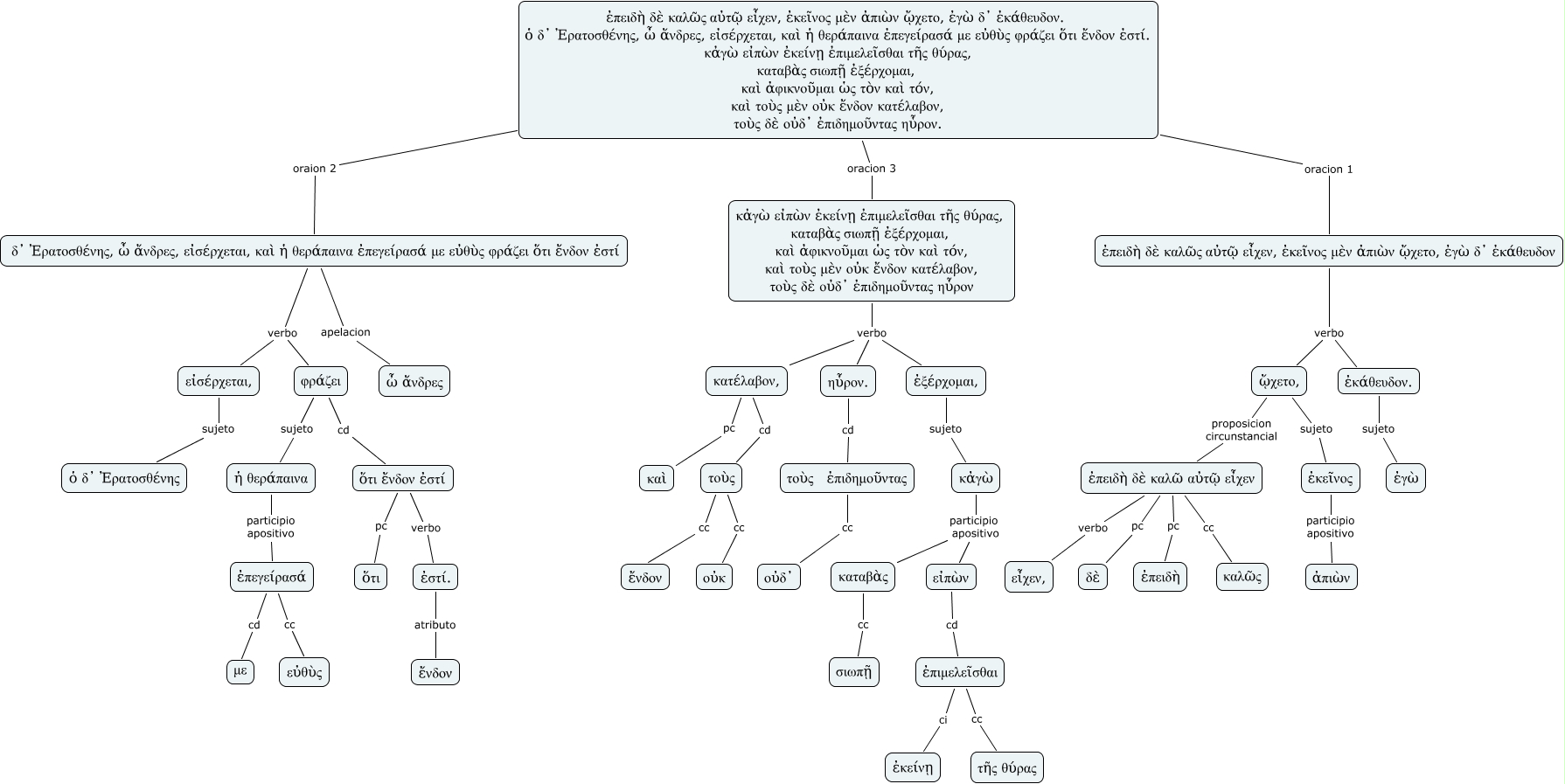 Este Cmap, tiene información relacionada con: Lisias I, 23_223019012009, ἐκάθευδον. sujeto ἐγὼ, κἀγὼ εἰπὼν ἐκείνῃ ἐπιμελεῖσθαι τῆς θύρας, καταβὰς σιωπῇ ἐξέρχομαι, καὶ ἀφικνοῦμαι ὡς τὸν καὶ τόν, καὶ τοὺς μὲν οὐκ ἔνδον κατέλαβον, τοὺς δὲ οὐδ᾿ ἐπιδημοῦντας ηὗρον verbo ἐξέρχομαι,, κἀγὼ εἰπὼν ἐκείνῃ ἐπιμελεῖσθαι τῆς θύρας, καταβὰς σιωπῇ ἐξέρχομαι, καὶ ἀφικνοῦμαι ὡς τὸν καὶ τόν, καὶ τοὺς μὲν οὐκ ἔνδον κατέλαβον, τοὺς δὲ οὐδ᾿ ἐπιδημοῦντας ηὗρον verbo κατέλαβον,, κατέλαβον, cd τοὺς, ἐπειδὴ δὲ καλῶ αὐτῷ εἶχεν verbo εἶχεν,, ἐπειδὴ δὲ καλῶ αὐτῷ εἶχεν pc δὲ, δ᾿ Ἐρατοσθένης, ὦ ἄνδρες, εἰσέρχεται, καὶ ἡ θεράπαινα ἐπεγείρασά με εὐθὺς φράζει ὅτι ἔνδον ἐστί verbo φράζει, ᾤχετο, proposicion circunstancial ἐπειδὴ δὲ καλῶ αὐτῷ εἶχεν, φράζει sujeto ἡ θεράπαινα, ἐπειδὴ δὲ καλῶς αὐτῷ εἶχεν, ἐκεῖνος μὲν ἀπιὼν ᾤχετο, ἐγὼ δ᾿ ἐκάθευδον verbo ᾤχετο,, ηὗρον. cd τοὺς ἐπιδημοῦντας, δ᾿ Ἐρατοσθένης, ὦ ἄνδρες, εἰσέρχεται, καὶ ἡ θεράπαινα ἐπεγείρασά με εὐθὺς φράζει ὅτι ἔνδον ἐστί apelacion ὦ ἄνδρες, ἐπειδὴ δὲ καλῶς αὐτῷ εἶχεν, ἐκεῖνος μὲν ἀπιὼν ᾤχετο, ἐγὼ δ᾿ ἐκάθευδον. ὁ δ᾿ Ἐρατοσθένης, ὦ ἄνδρες, εἰσέρχεται, καὶ ἡ θεράπαινα ἐπεγείρασά με εὐθὺς φράζει ὅτι ἔνδον ἐστί. κἀγὼ εἰπὼν ἐκείνῃ ἐπιμελεῖσθαι τῆς θύρας, καταβὰς σιωπῇ ἐξέρχομαι, καὶ ἀφικνοῦμαι ὡς τὸν καὶ τόν, καὶ τοὺς μὲν οὐκ ἔνδον κατέλαβον, τοὺς δὲ οὐδ᾿ ἐπιδημοῦντας ηὗρον. oracion 3 κἀγὼ εἰπὼν ἐκείνῃ ἐπιμελεῖσθαι τῆς θύρας, καταβὰς σιωπῇ ἐξέρχομαι, καὶ ἀφικνοῦμαι ὡς τὸν καὶ τόν, καὶ τοὺς μὲν οὐκ ἔνδον κατέλαβον, τοὺς δὲ οὐδ᾿ ἐπιδημοῦντας ηὗρον, ἐστί. atributo ἔνδον, ἐπιμελεῖσθαι cc τῆς θύρας, φράζει cd ὅτι ἔνδον ἐστί, ἐκεῖνος participio apositivo ἀπιὼν, ᾤχετο, sujeto ἐκεῖνος, κατέλαβον, pc καὶ, τοὺς cc ἔνδον