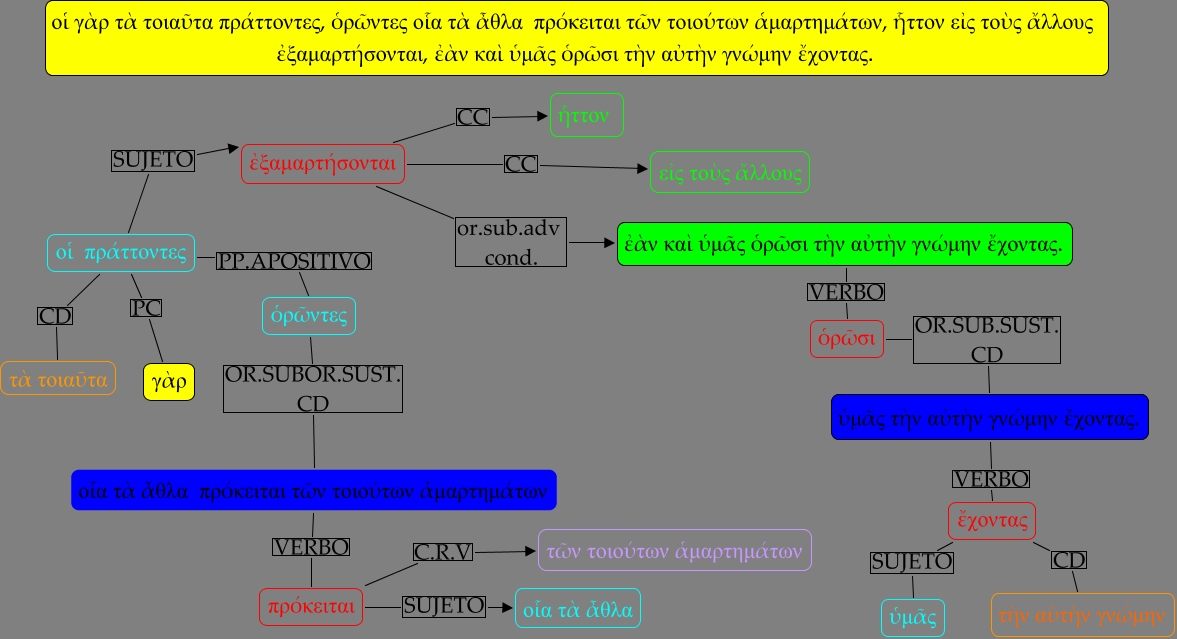 Este Cmap, tiene información relacionada con: Lisias I, 47b_1728_28_12, ἔχοντας CD τὴν αὐτὴν γνώμην, οἱ πράττοντες CD τὰ τοιαῦτα, ἐὰν καὶ ὑμᾶς ὁρῶσι τὴν αὐτὴν γνώμην ἔχοντας. VERBO ὁρῶσι, οἱ πράττοντες PC γὰρ, οἱ πράττοντες PP.APOSITIVO ὁρῶντες, ἐξαμαρτήσονται CC εἰς τοὺς ἄλλους, ὑμᾶς τὴν αὐτὴν γνώμην ἔχοντας. VERBO ἔχοντας, οἷα τὰ ἆθλα πρόκειται τῶν τοιούτων ἁμαρτημάτων VERBO πρόκειται, ὁρῶντες OR.SUBOR.SUST. CD οἷα τὰ ἆθλα πρόκειται τῶν τοιούτων ἁμαρτημάτων, οἱ πράττοντες SUJETO ἐξαμαρτήσονται, ἐξαμαρτήσονται CC ἧττον, πρόκειται C.R.V τῶν τοιούτων ἁμαρτημάτων, ἔχοντας SUJETO ὑμᾶς, ἐξαμαρτήσονται or.sub.adv cond. ἐὰν καὶ ὑμᾶς ὁρῶσι τὴν αὐτὴν γνώμην ἔχοντας., πρόκειται SUJETO οἷα τὰ ἆθλα, ὁρῶσι OR.SUB.SUST. CD ὑμᾶς τὴν αὐτὴν γνώμην ἔχοντας.
