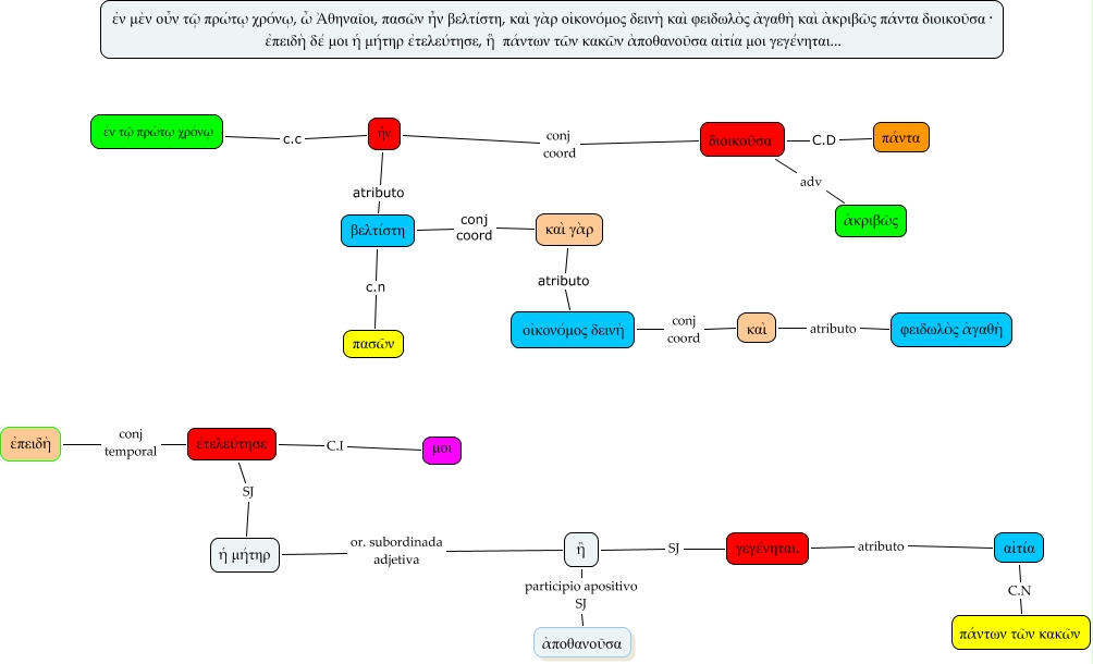 Este Cmap, tiene información relacionada con: parrafo 7, ἡ μήτηρ or. subordinada adjetiva ἣ, ἐτελεύτησε C.I μοι, διοικοῦσα C.D πάντα, οἰκονόμος δεινὴ conj coord καὶ, ἦν c.c ἐν τῷ πρώτῳ χρόνῳ, ἦν atributo βελτίστη, βελτίστη conj coord καὶ γὰρ, ἦν conj coord διοικοῦσα, ἣ participio apositivo SJ ἀποθανοῦσα, καὶ atributo φειδωλὸς ἀγαθὴ, ἐπειδὴ conj temporal ἐτελεύτησε, διοικοῦσα adv ἀκριβῶς, ἐτελεύτησε SJ ἡ μήτηρ, ἣ SJ γεγένηται., καὶ γὰρ atributo οἰκονόμος δεινὴ, αἰτία C.N πάντων τῶν κακῶν, γεγένηται. atributo αἰτία, βελτίστη c.n πασῶν
