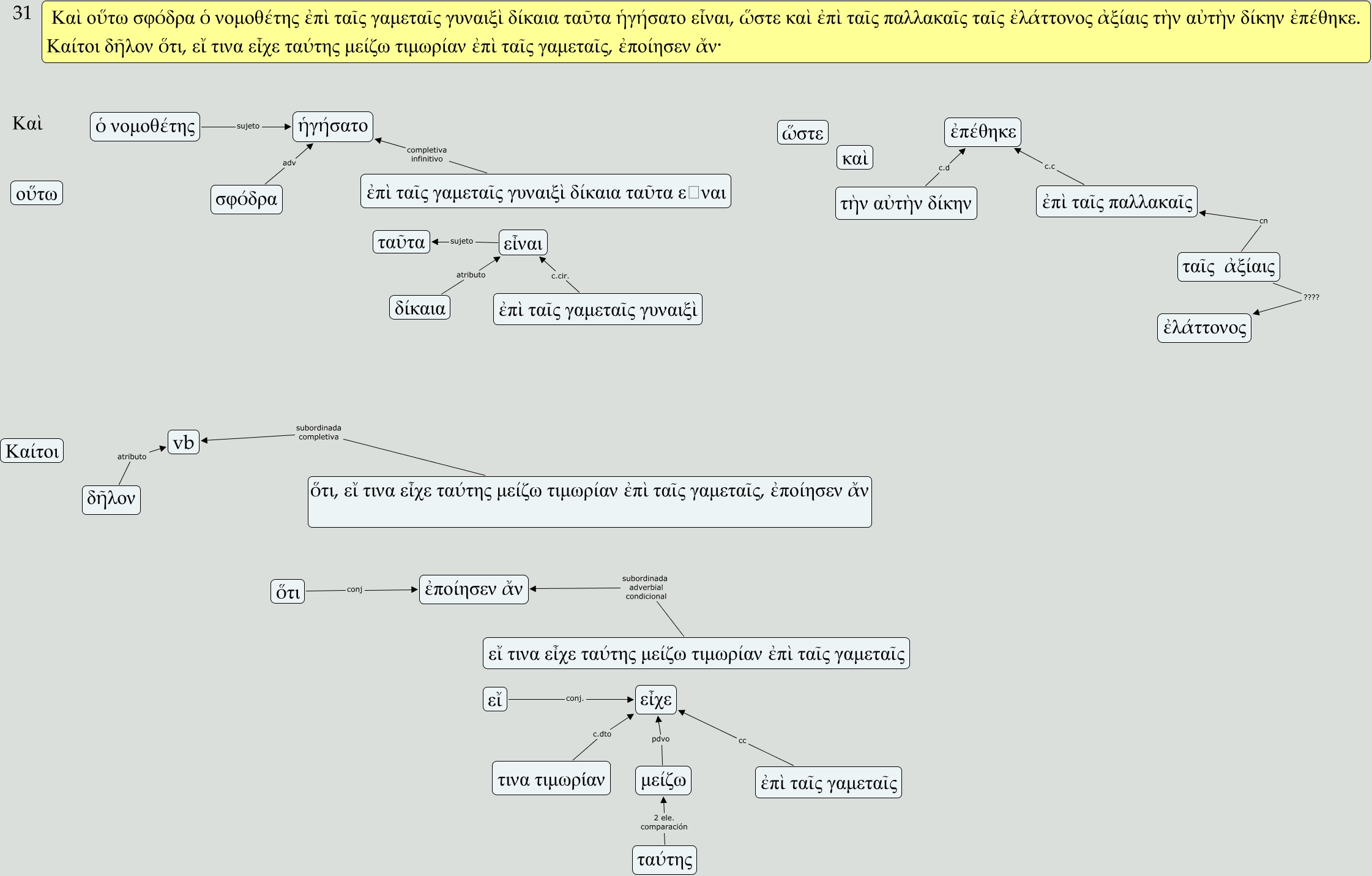 Este Cmap, tiene información relacionada con: Sin Título 3, ὅτι conj ἐποίησεν ἄν, ἐπὶ ταῖς παλλακαῖς c.c ἐπέθηκε, ταῖς ἀξίαις cn ἐπὶ ταῖς παλλακαῖς, ἐπὶ ταῖς γαμεταῖς γυναιξὶ c.cir. εἶναι, δῆλον atributo vb, ἐπὶ ταῖς γαμεταῖς cc εἶχε, ὁ νομοθέτης sujeto ἡγήσατο, δίκαια atributo εἶναι, εἶναι sujeto ταῦτα, ταῖς ἀξίαις ???? ἐλάττονος, εἴ τινα εἶχε ταύτης μείζω τιμωρίαν ἐπὶ ταῖς γαμεταῖς subordinada adverbial condicional ἐποίησεν ἄν, ὅτι, εἴ τινα εἶχε ταύτης μείζω τιμωρίαν ἐπὶ ταῖς γαμεταῖς, ἐποίησεν ἄν subordinada completiva vb, ταύτης 2 ele. comparación μείζω, σφόδρα adv ἡγήσατο, εἴ conj. εἶχε, μείζω pdvo εἶχε, ἐπὶ ταῖς γαμεταῖς γυναιξὶ δίκαια ταῦτα εἶναι completiva infinitivo ἡγήσατο, τινα τιμωρίαν c.dto εἶχε, τὴν αὐτὴν δίκην c.d ἐπέθηκε