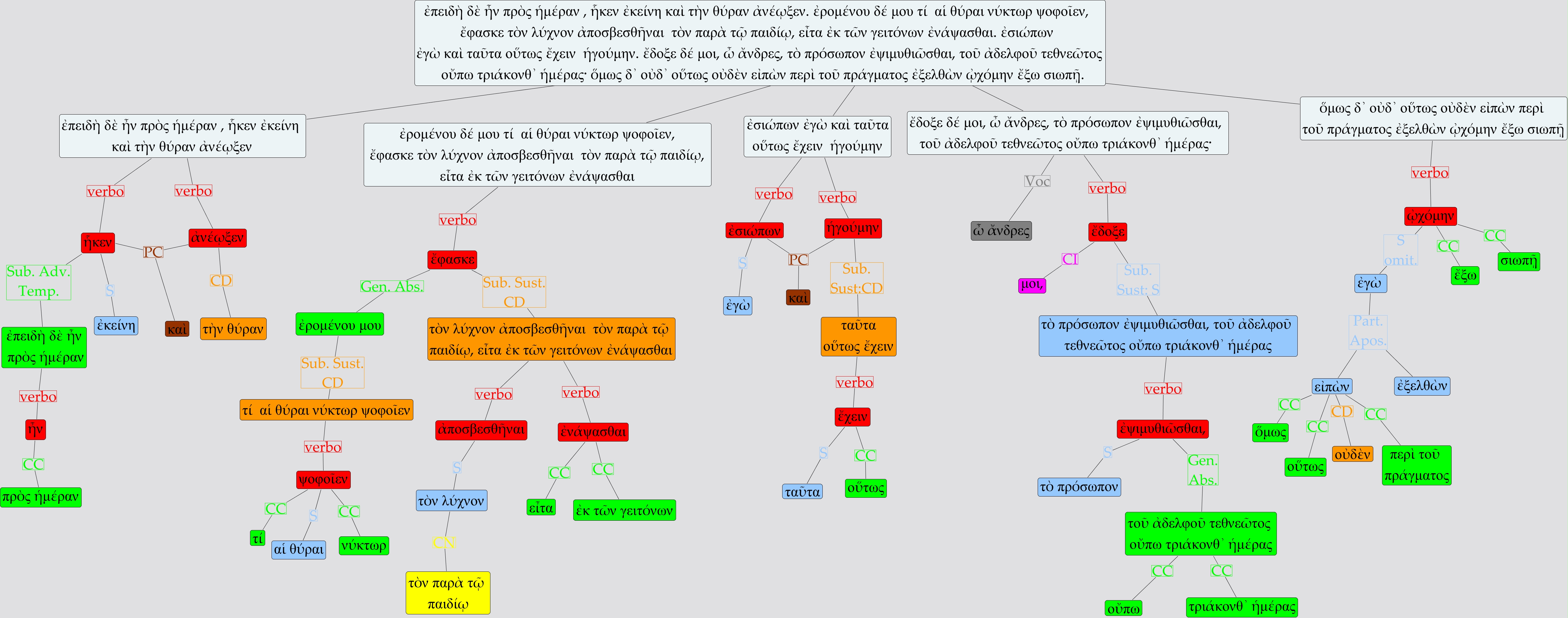 Este Cmap, tiene información relacionada con: Lisias I, 14_1730_19_01, ᾠχόμην S omit. ἐγὼ, τὸν λύχνον ἀποσβεσθῆναι τὸν παρὰ τῷ παιδίῳ, εἶτα ἐκ τῶν γειτόνων ἐνάψασθαι verbo ἀποσβεσθῆναι, ἡγούμην PC ἐσιώπων, τὸ πρόσωπον ἐψιμυθιῶσθαι, τοῦ ἀδελφοῦ τεθνεῶτος οὔπω τριάκονθ᾿ ἡμέρας verbo ἐψιμυθιῶσθαι,, ἐψιμυθιῶσθαι, Gen. Abs. τοῦ ἀδελφοῦ τεθνεῶτος οὔπω τριάκονθ᾿ ἡμέρας, ἔδοξε CI μοι,, ὅμως δ᾿ οὐδ᾿ οὕτως οὐδὲν εἰπὼν περὶ τοῦ πράγματος ἐξελθὼν ᾠχόμην ἔξω σιωπῇ verbo ᾠχόμην, ψοφοῖεν CC νύκτωρ, ἐρομένου μου Sub. Sust. CD τί αἱ θύραι νύκτωρ ψοφοῖεν, ἐγὼ Part. Apos. εἰπὼν, ταῦτα οὕτως ἔχειν verbo ἔχειν, ἔδοξε δέ μοι, ὦ ἄνδρες, τὸ πρόσωπον ἐψιμυθιῶσθαι, τοῦ ἀδελφοῦ τεθνεῶτος οὔπω τριάκονθ᾿ ἡμέρας· Voc ὦ ἄνδρες, τοῦ ἀδελφοῦ τεθνεῶτος οὔπω τριάκονθ᾿ ἡμέρας CC οὔπω, ἡγούμην PC καὶ, ἧκεν S ἐκείνη, ἀνέῳξεν PC ἧκεν, τί αἱ θύραι νύκτωρ ψοφοῖεν verbo ψοφοῖεν, ἐπειδὴ δὲ ἦν πρὸς ἡμέραν , ἧκεν ἐκείνη καὶ τὴν θύραν ἀνέῳξεν. ἐρομένου δέ μου τί αἱ θύραι νύκτωρ ψοφοῖεν, ἔφασκε τὸν λύχνον ἀποσβεσθῆναι τὸν παρὰ τῷ παιδίῳ, εἶτα ἐκ τῶν γειτόνων ἐνάψασθαι. ἐσιώπων ἐγὼ καὶ ταῦτα οὕτως ἔχειν ἡγούμην. ἔδοξε δέ μοι, ὦ ἄνδρες, τὸ πρόσωπον ἐψιμυθιῶσθαι, τοῦ ἀδελφοῦ τεθνεῶτος οὔπω τριάκονθ᾿ ἡμέρας· ὅμως δ᾿ οὐδ᾿ οὕτως οὐδὲν εἰπὼν περὶ τοῦ πράγματος ἐξελθὼν ᾠχόμην ἔξω σιωπῇ. ???? ὅμως δ᾿ οὐδ᾿ οὕτως οὐδὲν εἰπὼν περὶ τοῦ πράγματος ἐξελθὼν ᾠχόμην ἔξω σιωπῇ, ἐνάψασθαι CC εἶτα, ἡγούμην Sub. Sust:CD ταῦτα οὕτως ἔχειν