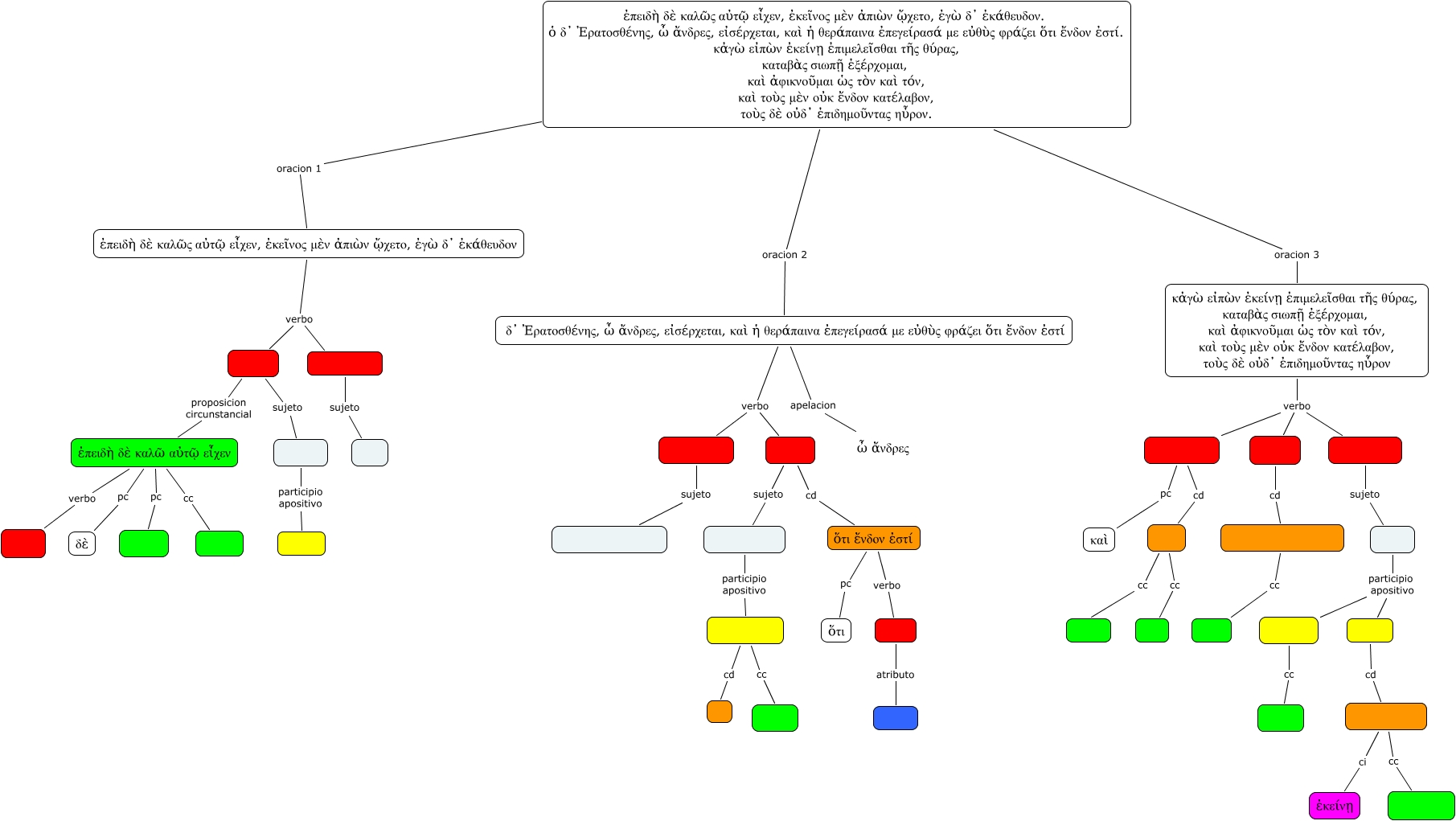Este Cmap, tiene información relacionada con: Lisias I, 23_114825(alu), κἀγὼ εἰπὼν ἐκείνῃ ἐπιμελεῖσθαι τῆς θύρας, καταβὰς σιωπῇ ἐξέρχομαι, καὶ ἀφικνοῦμαι ὡς τὸν καὶ τόν, καὶ τοὺς μὲν οὐκ ἔνδον κατέλαβον, τοὺς δὲ οὐδ᾿ ἐπιδημοῦντας ηὗρον verbo κατέλαβον,, κἀγὼ εἰπὼν ἐκείνῃ ἐπιμελεῖσθαι τῆς θύρας, καταβὰς σιωπῇ ἐξέρχομαι, καὶ ἀφικνοῦμαι ὡς τὸν καὶ τόν, καὶ τοὺς μὲν οὐκ ἔνδον κατέλαβον, τοὺς δὲ οὐδ᾿ ἐπιδημοῦντας ηὗρον verbo ἐξέρχομαι,, ἐκάθευδον. sujeto ἐγὼ, δ᾿ Ἐρατοσθένης, ὦ ἄνδρες, εἰσέρχεται, καὶ ἡ θεράπαινα ἐπεγείρασά με εὐθὺς φράζει ὅτι ἔνδον ἐστί verbo φράζει, ἐπειδὴ δὲ καλῶ αὐτῷ εἶχεν pc δὲ, ἐπειδὴ δὲ καλῶ αὐτῷ εἶχεν verbo εἶχεν,, κατέλαβον, cd τοὺς, ᾤχετο, proposicion circunstancial ἐπειδὴ δὲ καλῶ αὐτῷ εἶχεν, ἐπειδὴ δὲ καλῶς αὐτῷ εἶχεν, ἐκεῖνος μὲν ἀπιὼν ᾤχετο, ἐγὼ δ᾿ ἐκάθευδον verbo ᾤχετο,, φράζει sujeto ἡ θεράπαινα, ηὗρον. cd τοὺς ἐπιδημοῦντας, ἐπειδὴ δὲ καλῶς αὐτῷ εἶχεν, ἐκεῖνος μὲν ἀπιὼν ᾤχετο, ἐγὼ δ᾿ ἐκάθευδον. ὁ δ᾿ Ἐρατοσθένης, ὦ ἄνδρες, εἰσέρχεται, καὶ ἡ θεράπαινα ἐπεγείρασά με εὐθὺς φράζει ὅτι ἔνδον ἐστί. κἀγὼ εἰπὼν ἐκείνῃ ἐπιμελεῖσθαι τῆς θύρας, καταβὰς σιωπῇ ἐξέρχομαι, καὶ ἀφικνοῦμαι ὡς τὸν καὶ τόν, καὶ τοὺς μὲν οὐκ ἔνδον κατέλαβον, τοὺς δὲ οὐδ᾿ ἐπιδημοῦντας ηὗρον. oracion 3 κἀγὼ εἰπὼν ἐκείνῃ ἐπιμελεῖσθαι τῆς θύρας, καταβὰς σιωπῇ ἐξέρχομαι, καὶ ἀφικνοῦμαι ὡς τὸν καὶ τόν, καὶ τοὺς μὲν οὐκ ἔνδον κατέλαβον, τοὺς δὲ οὐδ᾿ ἐπιδημοῦντας ηὗρον, δ᾿ Ἐρατοσθένης, ὦ ἄνδρες, εἰσέρχεται, καὶ ἡ θεράπαινα ἐπεγείρασά με εὐθὺς φράζει ὅτι ἔνδον ἐστί apelacion ὦ ἄνδρες, ἐπιμελεῖσθαι cc τῆς θύρας, ἐστί. atributo ἔνδον, φράζει cd ὅτι ἔνδον ἐστί, ᾤχετο, sujeto ἐκεῖνος, ἐκεῖνος participio apositivo ἀπιὼν, κατέλαβον, pc καὶ, τοὺς cc ἔνδον