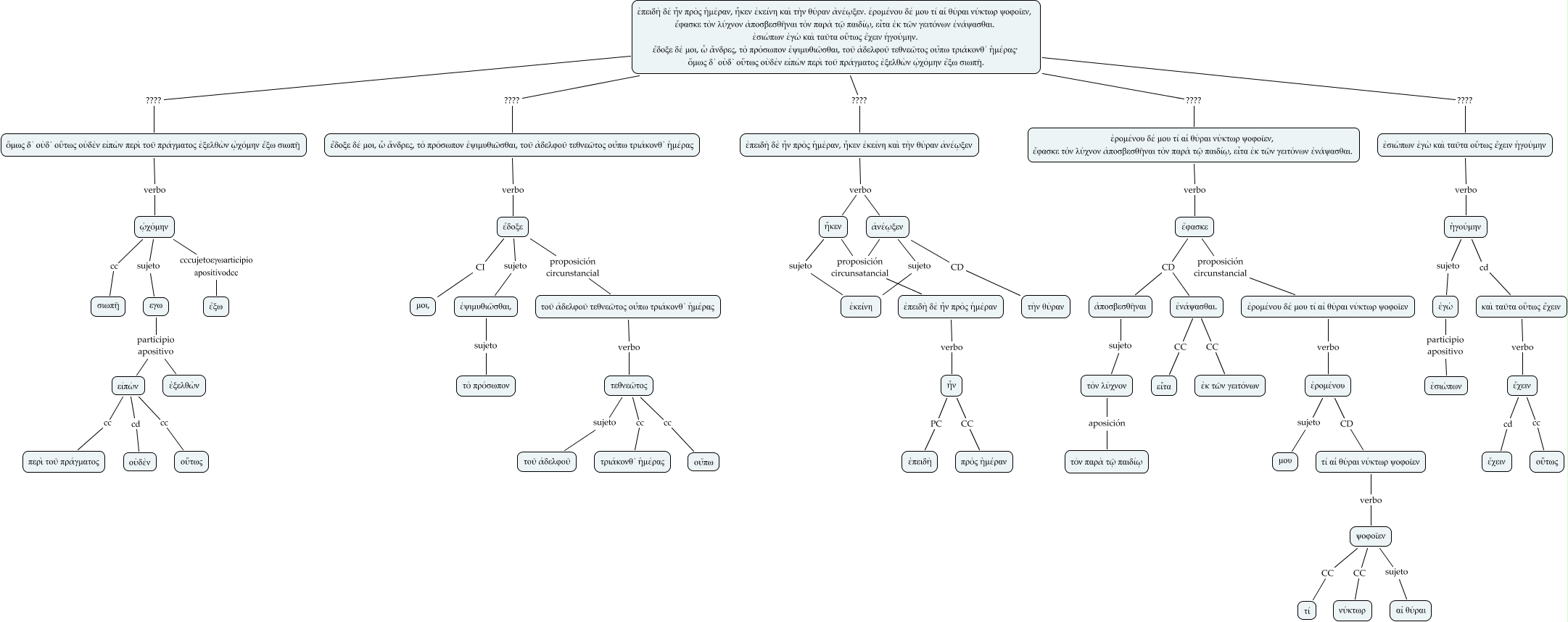 Este Cmap, tiene información relacionada con: Lisias I, 14_083006012009, ἐπειδὴ δὲ ἦν πρὸς ἡμέραν verbo ἦν, ἐρομένου δέ μου τί αἱ θύραι νύκτωρ ψοφοῖεν verbo ἐρομένου, ἀνέῳξεν CD τὴν θύραν, ἐπειδὴ δὲ ἦν πρὸς ἡμέραν, ἧκεν ἐκείνη καὶ τὴν θύραν ἀνέῳξεν verbo ἀνέῳξεν, ἦν CC πρὸς ἡμέραν, εγω participio apositivo εἰπὼν, ἐπειδὴ δὲ ἦν πρὸς ἡμέραν, ἧκεν ἐκείνη καὶ τὴν θύραν ἀνέῳξεν. ἐρομένου δέ μου τί αἱ θύραι νύκτωρ ψοφοῖεν, ἔφασκε τὸν λύχνον ἀποσβεσθῆναι τὸν παρὰ τῷ παιδίῳ, εἶτα ἐκ τῶν γειτόνων ἐνάψασθαι. ἐσιώπων ἐγὼ καὶ ταῦτα οὕτως ἔχειν ἡγούμην. ἔδοξε δέ μοι, ὦ ἄνδρες, τὸ πρόσωπον ἐψιμυθιῶσθαι, τοῦ ἀδελφοῦ τεθνεῶτος οὔπω τριάκονθ᾿ ἡμέρας· ὅμως δ᾿ οὐδ᾿ οὕτως οὐδὲν εἰπὼν περὶ τοῦ πράγματος ἐξελθὼν ᾠχόμην ἔξω σιωπῇ. ???? ἐσιώπων ἐγὼ καὶ ταῦτα οὕτως ἔχειν ἡγούμην, εγω participio apositivo ἐξελθὼν, τεθνεῶτος cc τριάκονθ᾿ ἡμέρας, τεθνεῶτος sujeto τοῦ ἀδελφοῦ, ἐπειδὴ δὲ ἦν πρὸς ἡμέραν, ἧκεν ἐκείνη καὶ τὴν θύραν ἀνέῳξεν. ἐρομένου δέ μου τί αἱ θύραι νύκτωρ ψοφοῖεν, ἔφασκε τὸν λύχνον ἀποσβεσθῆναι τὸν παρὰ τῷ παιδίῳ, εἶτα ἐκ τῶν γειτόνων ἐνάψασθαι. ἐσιώπων ἐγὼ καὶ ταῦτα οὕτως ἔχειν ἡγούμην. ἔδοξε δέ μοι, ὦ ἄνδρες, τὸ πρόσωπον ἐψιμυθιῶσθαι, τοῦ ἀδελφοῦ τεθνεῶτος οὔπω τριάκονθ᾿ ἡμέρας· ὅμως δ᾿ οὐδ᾿ οὕτως οὐδὲν εἰπὼν περὶ τοῦ πράγματος ἐξελθὼν ᾠχόμην ἔξω σιωπῇ. ???? ἐπειδὴ δὲ ἦν πρὸς ἡμέραν, ἧκεν ἐκείνη καὶ τὴν θύραν ἀνέῳξεν, εἰπὼν cc οὕτως, τοῦ ἀδελφοῦ τεθνεῶτος οὔπω τριάκονθ᾿ ἡμέρας verbo τεθνεῶτος, ὅμως δ᾿ οὐδ᾿ οὕτως οὐδὲν εἰπὼν περὶ τοῦ πράγματος ἐξελθὼν ᾠχόμην ἔξω σιωπῇ verbo ᾠχόμην, ἀποσβεσθῆναι sujeto τὸν λύχνον, ἔδοξε CI μοι,, ἦν PC ἐπειδὴ, ἔχειν cc οὕτως, ἧκεν proposición circunsatancial ἐπειδὴ δὲ ἦν πρὸς ἡμέραν, ἔδοξε δέ μοι, ὦ ἄνδρες, τὸ πρόσωπον ἐψιμυθιῶσθαι, τοῦ ἀδελφοῦ τεθνεῶτος οὔπω τριάκονθ᾿ ἡμέρας verbo ἔδοξε