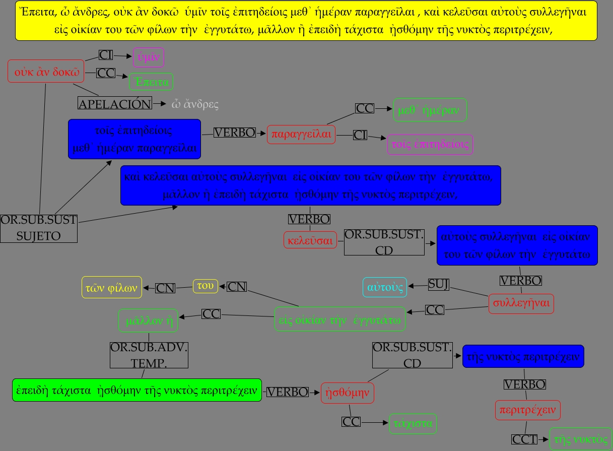 Este Cmap, tiene información relacionada con: Lisias I, 41a_2227_11_1, ἐπειδὴ τάχιστα ᾐσθόμην τῆς νυκτὸς περιτρέχειν VERBO ᾐσθόμην, εἰς οἰκίαν τὴν ἐγγυτάτω CC μᾶλλον ἢ, οὐκ ἂν δοκῶ CC Ἔπειτα, παραγγεῖλαι CI τοῖς ἐπιτηδείοις, ᾐσθόμην CC τάχιστα, οὐκ ἂν δοκῶ OR.SUB.SUST SUJETO καὶ κελεῦσαι αὐτοὺς συλλεγῆναι εἰς οἰκίαν του τῶν φίλων τὴν ἐγγυτάτω, μᾶλλον ἢ ἐπειδὴ τάχιστα ᾐσθόμην τῆς νυκτὸς περιτρέχειν,, συλλεγῆναι CC εἰς οἰκίαν τὴν ἐγγυτάτω, ᾐσθόμην OR.SUB.SUST. CD τῆς νυκτὸς περιτρέχειν, εἰς οἰκίαν τὴν ἐγγυτάτω CN του, κελεῦσαι OR.SUB.SUST. CD αὐτοὺς συλλεγῆναι εἰς οἰκίαν του τῶν φίλων τὴν ἐγγυτάτω, οὐκ ἂν δοκῶ CI ὑμῖν, μᾶλλον ἢ OR.SUB.ADV. TEMP. ἐπειδὴ τάχιστα ᾐσθόμην τῆς νυκτὸς περιτρέχειν, τῆς νυκτὸς περιτρέχειν VERBO περιτρέχειν, καὶ κελεῦσαι αὐτοὺς συλλεγῆναι εἰς οἰκίαν του τῶν φίλων τὴν ἐγγυτάτω, μᾶλλον ἢ ἐπειδὴ τάχιστα ᾐσθόμην τῆς νυκτὸς περιτρέχειν, VERBO κελεῦσαι, τοῖς ἐπιτηδείοις μεθ᾿ ἡμέραν παραγγεῖλαι VERBO παραγγεῖλαι, οὐκ ἂν δοκῶ APELACIÓN ὦ ἄνδρες, περιτρέχειν CCT τῆς νυκτὸς, αὐτοὺς συλλεγῆναι εἰς οἰκίαν του τῶν φίλων τὴν ἐγγυτάτω VERBO συλλεγῆναι, οὐκ ἂν δοκῶ OR.SUB.SUST SUJETO τοῖς ἐπιτηδείοις μεθ᾿ ἡμέραν παραγγεῖλαι, παραγγεῖλαι CC μεθ᾿ ἡμέραν