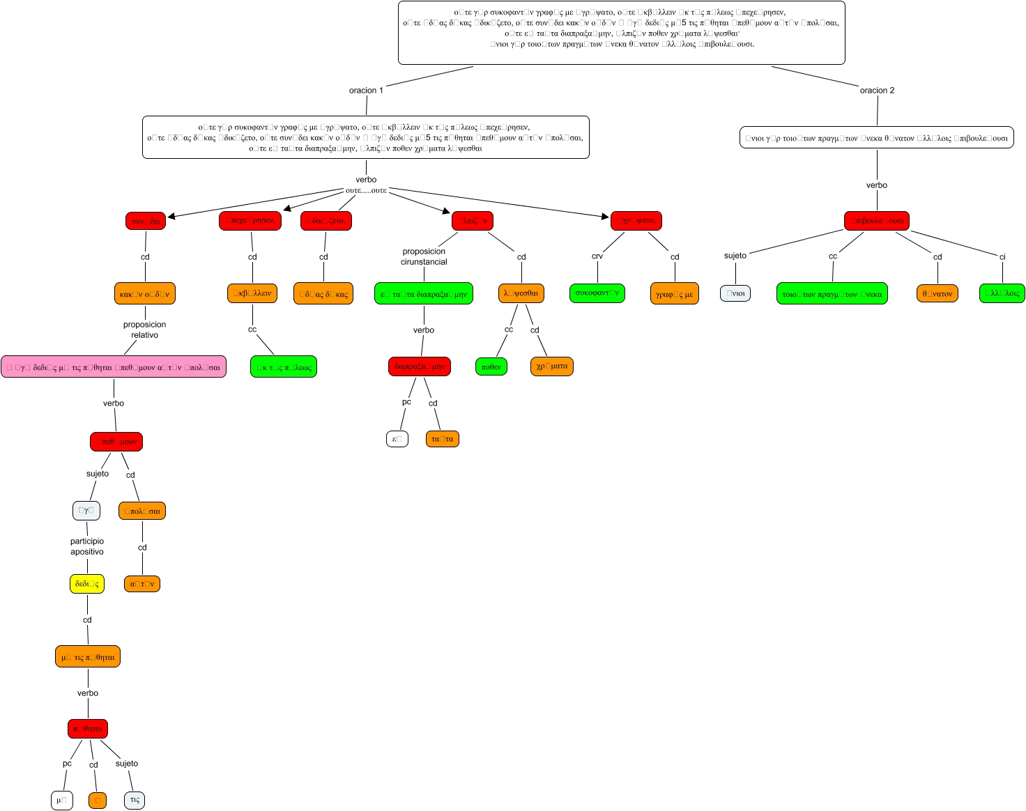 Este Cmap, tiene información relacionada con: Lisias I, 44_115625, ἐδικάζετο, cd ἰδίας δίκας, ἐγὼ participio apositivo δεδιὼς, πύθηται cd ὃ, οὔτε γὰρ συκοφαντῶν γραφάς με ἐγράψατο, οὔτε ἐκβάλλειν ἐκ τῆς πόλεως ἐπεχείρησεν, οὔτε ἰδίας δίκας ἐδικάζετο, οὔτε συνῄδει κακὸν οὐδὲν ὃ ἐγὼ δεδιὼς μή5 τις πύθηται ἐπεθύμουν αὐτὸν ἀπολέσαι, οὔτε εἰ ταῦτα διαπραξαίμην, ἤλπιζόν ποθεν χρήματα λήψεσθαι verbo ουτε.....ουτε συνῄδει, διαπραξαίμην cd ταῦτα, ἐπεθύμουν sujeto ἐγὼ, κακὸν οὐδὲν proposicion relativo ὃ ἐγὼ δεδιὼς μή τις πύθηται ἐπεθύμουν αὐτὸν ἀπολέσαι, πύθηται pc μή, δεδιὼς cd μή τις πύθηται, οὔτε γὰρ συκοφαντῶν γραφάς με ἐγράψατο, οὔτε ἐκβάλλειν ἐκ τῆς πόλεως ἐπεχείρησεν, οὔτε ἰδίας δίκας ἐδικάζετο, οὔτε συνῄδει κακὸν οὐδὲν ὃ ἐγὼ δεδιὼς μή5 τις πύθηται ἐπεθύμουν αὐτὸν ἀπολέσαι, οὔτε εἰ ταῦτα διαπραξαίμην, ἤλπιζόν ποθεν χρήματα λήψεσθαι verbo ουτε.....ουτε ἤλπιζόν, εἰ ταῦτα διαπραξαίμην verbo διαπραξαίμην, οὔτε γὰρ συκοφαντῶν γραφάς με ἐγράψατο, οὔτε ἐκβάλλειν ἐκ τῆς πόλεως ἐπεχείρησεν, οὔτε ἰδίας δίκας ἐδικάζετο, οὔτε συνῄδει κακὸν οὐδὲν ὃ ἐγὼ δεδιὼς μή5 τις πύθηται ἐπεθύμουν αὐτὸν ἀπολέσαι, οὔτε εἰ ταῦτα διαπραξαίμην, ἤλπιζόν ποθεν χρήματα λήψεσθαι verbo ουτε.....ουτε ἐπεχείρησεν,, οὔτε γὰρ συκοφαντῶν γραφάς με ἐγράψατο, οὔτε ἐκβάλλειν ἐκ τῆς πόλεως ἐπεχείρησεν, οὔτε ἰδίας δίκας ἐδικάζετο, οὔτε συνῄδει κακὸν οὐδὲν ὃ ἐγὼ δεδιὼς μή5 τις πύθηται ἐπεθύμουν αὐτὸν ἀπολέσαι, οὔτε εἰ ταῦτα διαπραξαίμην, ἤλπιζόν ποθεν χρήματα λήψεσθαι· ἔνιοι γὰρ τοιούτων πραγμάτων ἕνεκα θάνατον ἀλλήλοις ἐπιβουλεύουσι. oracion 1 οὔτε γὰρ συκοφαντῶν γραφάς με ἐγράψατο, οὔτε ἐκβάλλειν ἐκ τῆς πόλεως ἐπεχείρησεν, οὔτε ἰδίας δίκας ἐδικάζετο, οὔτε συνῄδει κακὸν οὐδὲν ὃ ἐγὼ δεδιὼς μή5 τις πύθηται ἐπεθύμουν αὐτὸν ἀπολέσαι, οὔτε εἰ ταῦτα διαπραξαίμην, ἤλπιζόν ποθεν χρήματα λήψεσθαι, ἔνιοι γὰρ τοιούτων πραγμάτων ἕνεκα θάνατον ἀλλήλοις ἐπιβουλεύουσι verbo ἐπιβουλεύουσι, ἐγράψατο, crv συκοφαντῶν, ἐκβάλλειν cc ἐκ τῆς πόλεως, συνῄδει cd κακὸν οὐδὲν, ἐγράψατο, cd γραφάς με, μή τις πύθηται verbo πύθηται, ἐπιβουλεύουσι sujeto ἔνιοι