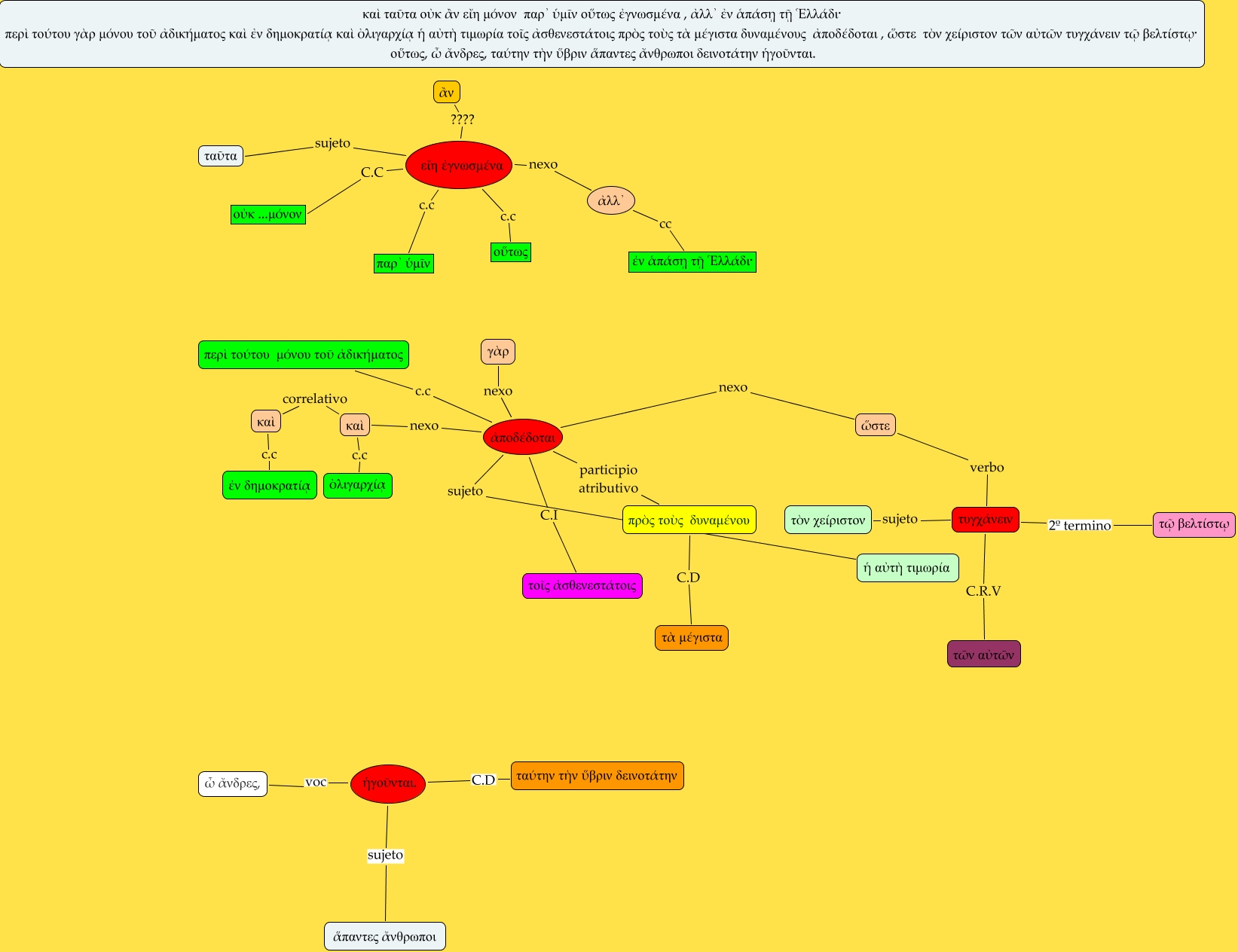 Este Cmap, tiene información relacionada con: parrafo2, ὀλιγαρχίᾳ c.c καὶ, ὥστε verbo τυγχάνειν, τυγχάνειν C.R.V τῶν αὐτῶν, ἡγοῦνται. sujeto ἅπαντες ἄνθρωποι, καὶ correlativo καὶ, ἀποδέδοται nexo γὰρ, ἀποδέδοται participio atributivo πρὸς τοὺς δυναμένου, τυγχάνειν 2º termino τῷ βελτίστῳ, τυγχάνειν sujeto τὸν χείριστον, εἴη ἐγνωσμένα sujeto ταῦτα, εἴη ἐγνωσμένα c.c οὕτως, ἀποδέδοται sujeto ἡ αὐτὴ τιμωρία, ἀποδέδοται C.I τοῖς ἀσθενεστάτοις, ἀποδέδοται nexo καὶ, εἴη ἐγνωσμένα nexo ἀλλ᾿, εἴη ἐγνωσμένα ???? ἂν, ἀλλ᾿ cc ἐν ἁπάσῃ τῇ Ἑλλάδι·, καὶ c.c ἐν δημοκρατίᾳ, ἡγοῦνται. voc ὦ ἄνδρες,, ἀποδέδοται c.c περὶ τούτου μόνου τοῦ ἀδικήματος