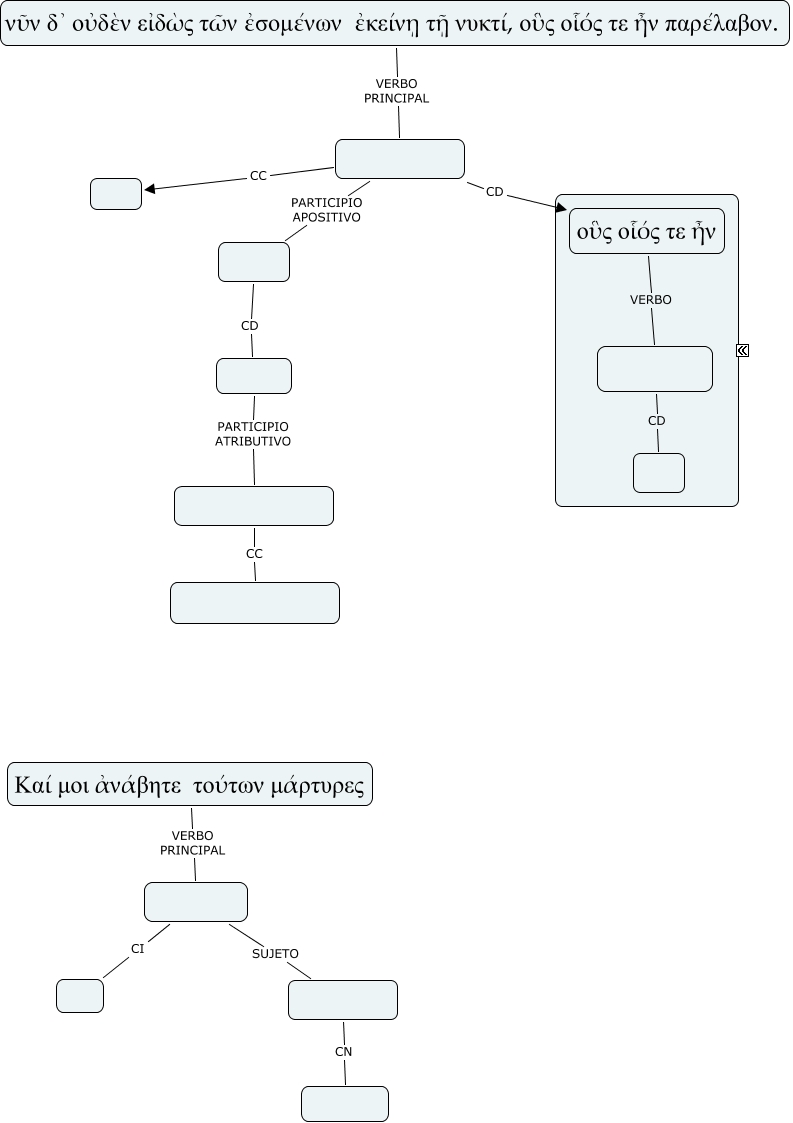 Este Cmap, tiene información relacionada con: Lisias I, 42_2040_27_01 TRIS, μάρτυρες CN τούτων, ἀνάβητε CI μοι, ἀνάβητε SUJETO μάρτυρες, οὓς οἷός τε ἦν VERBO οἷός τε ἦν, παρέλαβον. CD οὓς οἷός τε ἦν, τῶν ἐσομένων CC ἐκείνῃ τῇ νυκτί, παρέλαβον. CC νῦν, παρέλαβον. PARTICIPIO APOSITIVO εἰδὼς, οὐδὲν PARTICIPIO ATRIBUTIVO τῶν ἐσομένων, Καί μοι ἀνάβητε τούτων μάρτυρες VERBO PRINCIPAL ἀνάβητε, οἷός τε ἦν CD οὓς, νῦν δ᾿ οὐδὲν εἰδὼς τῶν ἐσομένων ἐκείνῃ τῇ νυκτί, οὓς οἷός τε ἦν παρέλαβον. VERBO PRINCIPAL παρέλαβον., εἰδὼς CD οὐδὲν