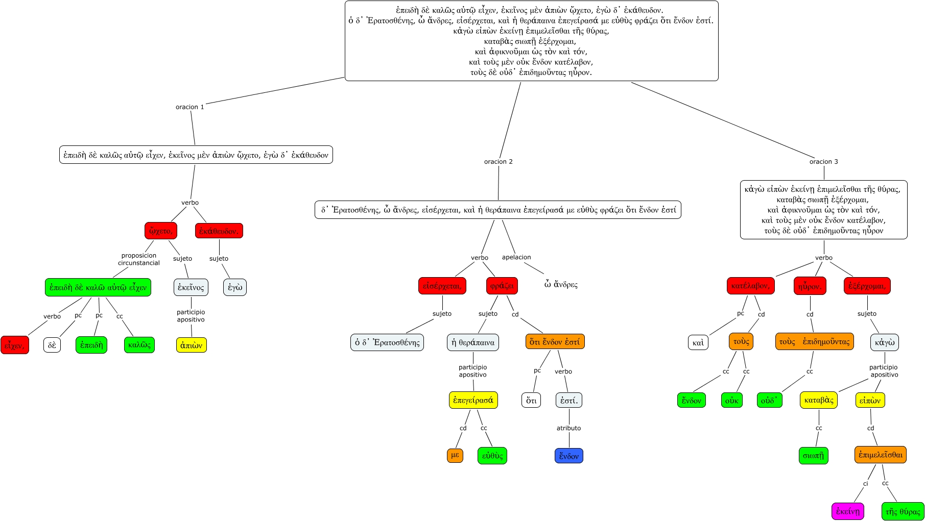 Este Cmap, tiene información relacionada con: Lisias I, 23_114825, κἀγὼ εἰπὼν ἐκείνῃ ἐπιμελεῖσθαι τῆς θύρας, καταβὰς σιωπῇ ἐξέρχομαι, καὶ ἀφικνοῦμαι ὡς τὸν καὶ τόν, καὶ τοὺς μὲν οὐκ ἔνδον κατέλαβον, τοὺς δὲ οὐδ᾿ ἐπιδημοῦντας ηὗρον verbo κατέλαβον,, κἀγὼ εἰπὼν ἐκείνῃ ἐπιμελεῖσθαι τῆς θύρας, καταβὰς σιωπῇ ἐξέρχομαι, καὶ ἀφικνοῦμαι ὡς τὸν καὶ τόν, καὶ τοὺς μὲν οὐκ ἔνδον κατέλαβον, τοὺς δὲ οὐδ᾿ ἐπιδημοῦντας ηὗρον verbo ἐξέρχομαι,, ἐκάθευδον. sujeto ἐγὼ, δ᾿ Ἐρατοσθένης, ὦ ἄνδρες, εἰσέρχεται, καὶ ἡ θεράπαινα ἐπεγείρασά με εὐθὺς φράζει ὅτι ἔνδον ἐστί verbo φράζει, ἐπειδὴ δὲ καλῶ αὐτῷ εἶχεν pc δὲ, ἐπειδὴ δὲ καλῶ αὐτῷ εἶχεν verbo εἶχεν,, κατέλαβον, cd τοὺς, ᾤχετο, proposicion circunstancial ἐπειδὴ δὲ καλῶ αὐτῷ εἶχεν, ἐπειδὴ δὲ καλῶς αὐτῷ εἶχεν, ἐκεῖνος μὲν ἀπιὼν ᾤχετο, ἐγὼ δ᾿ ἐκάθευδον verbo ᾤχετο,, φράζει sujeto ἡ θεράπαινα, ηὗρον. cd τοὺς ἐπιδημοῦντας, ἐπειδὴ δὲ καλῶς αὐτῷ εἶχεν, ἐκεῖνος μὲν ἀπιὼν ᾤχετο, ἐγὼ δ᾿ ἐκάθευδον. ὁ δ᾿ Ἐρατοσθένης, ὦ ἄνδρες, εἰσέρχεται, καὶ ἡ θεράπαινα ἐπεγείρασά με εὐθὺς φράζει ὅτι ἔνδον ἐστί. κἀγὼ εἰπὼν ἐκείνῃ ἐπιμελεῖσθαι τῆς θύρας, καταβὰς σιωπῇ ἐξέρχομαι, καὶ ἀφικνοῦμαι ὡς τὸν καὶ τόν, καὶ τοὺς μὲν οὐκ ἔνδον κατέλαβον, τοὺς δὲ οὐδ᾿ ἐπιδημοῦντας ηὗρον. oracion 3 κἀγὼ εἰπὼν ἐκείνῃ ἐπιμελεῖσθαι τῆς θύρας, καταβὰς σιωπῇ ἐξέρχομαι, καὶ ἀφικνοῦμαι ὡς τὸν καὶ τόν, καὶ τοὺς μὲν οὐκ ἔνδον κατέλαβον, τοὺς δὲ οὐδ᾿ ἐπιδημοῦντας ηὗρον, δ᾿ Ἐρατοσθένης, ὦ ἄνδρες, εἰσέρχεται, καὶ ἡ θεράπαινα ἐπεγείρασά με εὐθὺς φράζει ὅτι ἔνδον ἐστί apelacion ὦ ἄνδρες, ἐπιμελεῖσθαι cc τῆς θύρας, ἐστί. atributo ἔνδον, φράζει cd ὅτι ἔνδον ἐστί, ᾤχετο, sujeto ἐκεῖνος, ἐκεῖνος participio apositivo ἀπιὼν, κατέλαβον, pc καὶ, τοὺς cc ἔνδον