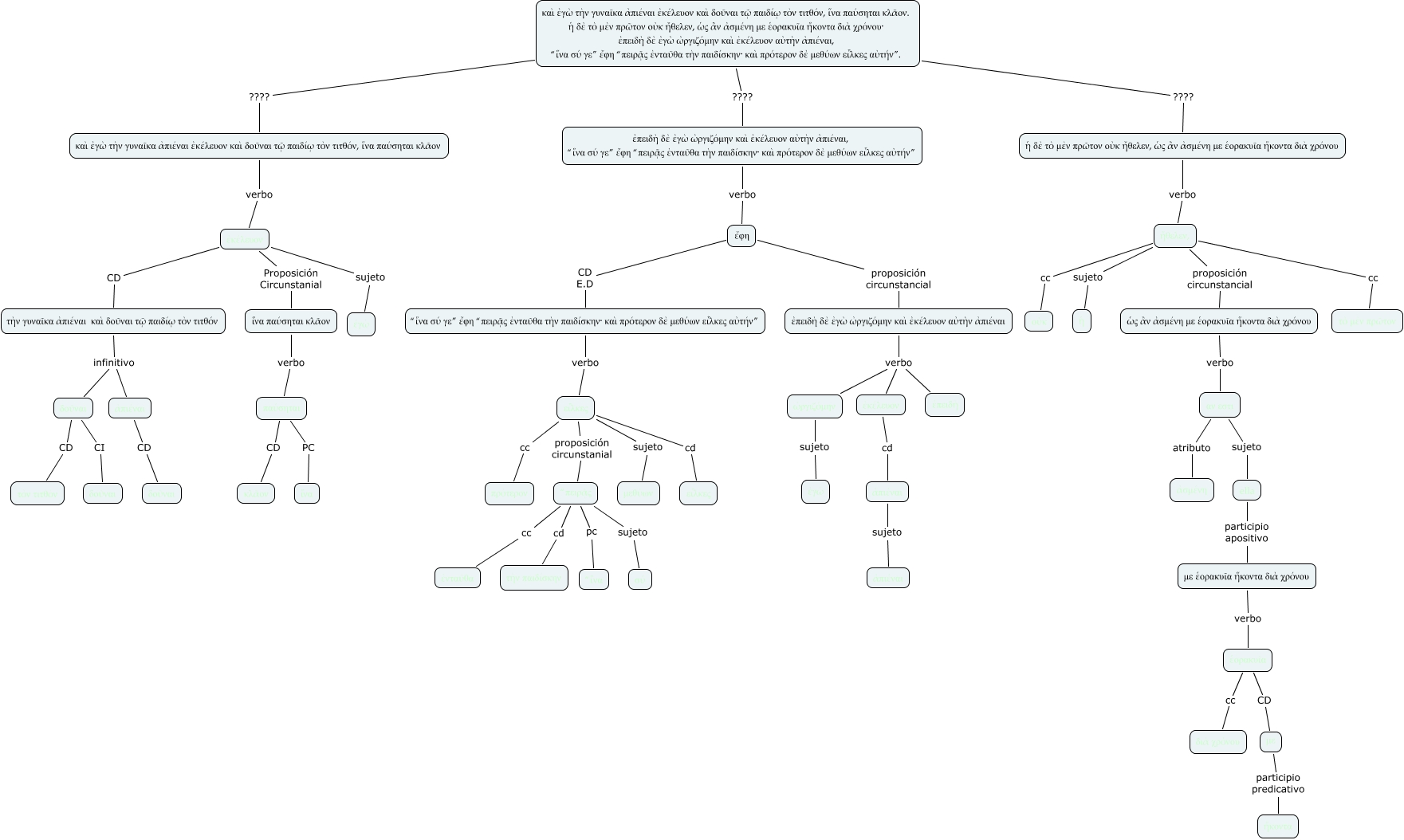 Este Cmap, tiene información relacionada con: Lisias I, 12_080006012009(alu), ἑορακυῖα CD με, τὴν γυναῖκα ἀπιέναι καὶ δοῦναι τῷ παιδίῳ τὸν τιτθόν infinitivo δοῦναι, ἔφη CD E.D “ἵνα σύ γε” ἔφη “πειρᾷς ἐνταῦθα τὴν παιδίσκην· καὶ πρότερον δὲ μεθύων εἷλκες αὐτήν”, ἤθελεν, cc τὸ μὲν πρῶτον, ἤθελεν, sujeto ἡ, ἤθελεν, proposición circunstancial ὡς ἂν ἀσμένη με ἑορακυῖα ἥκοντα διὰ χρόνου, δοῦναι CD τὸν τιτθόν, ὠργιζόμην sujeto ἐγὼ, ἐκέλευον CD τὴν γυναῖκα ἀπιέναι καὶ δοῦναι τῷ παιδίῳ τὸν τιτθόν, ἡ δὲ τὸ μὲν πρῶτον οὐκ ἤθελεν, ὡς ἂν ἀσμένη με ἑορακυῖα ἥκοντα διὰ χρόνου verbo ἤθελεν,, εἷλκες cc πρότερον, ἀπιέναι CD δοῦναι, αν εστι atributo ἀσμένη, καὶ ἐγὼ τὴν γυναῖκα ἀπιέναι ἐκέλευον καὶ δοῦναι τῷ παιδίῳ τὸν τιτθόν, ἵνα παύσηται κλᾶον verbo ἐκέλευον, καὶ ἐγὼ τὴν γυναῖκα ἀπιέναι ἐκέλευον καὶ δοῦναι τῷ παιδίῳ τὸν τιτθόν, ἵνα παύσηται κλᾶον. ἡ δὲ τὸ μὲν πρῶτον οὐκ ἤθελεν, ὡς ἂν ἀσμένη με ἑορακυῖα ἥκοντα διὰ χρόνου· ἐπειδὴ δὲ ἐγὼ ὠργιζόμην καὶ ἐκέλευον αὐτὴν ἀπιέναι, “ἵνα σύ γε” ἔφη “πειρᾷς ἐνταῦθα τὴν παιδίσκην· καὶ πρότερον δὲ μεθύων εἷλκες αὐτήν”. ???? καὶ ἐγὼ τὴν γυναῖκα ἀπιέναι ἐκέλευον καὶ δοῦναι τῷ παιδίῳ τὸν τιτθόν, ἵνα παύσηται κλᾶον, ἤθελεν, cc οὐκ, εἷλκες sujeto μεθύων, ὡς ἂν ἀσμένη με ἑορακυῖα ἥκοντα διὰ χρόνου verbo αν εστι, τὴν γυναῖκα ἀπιέναι καὶ δοῦναι τῷ παιδίῳ τὸν τιτθόν infinitivo ἀπιέναι, εἷλκες cd εἷλκες
