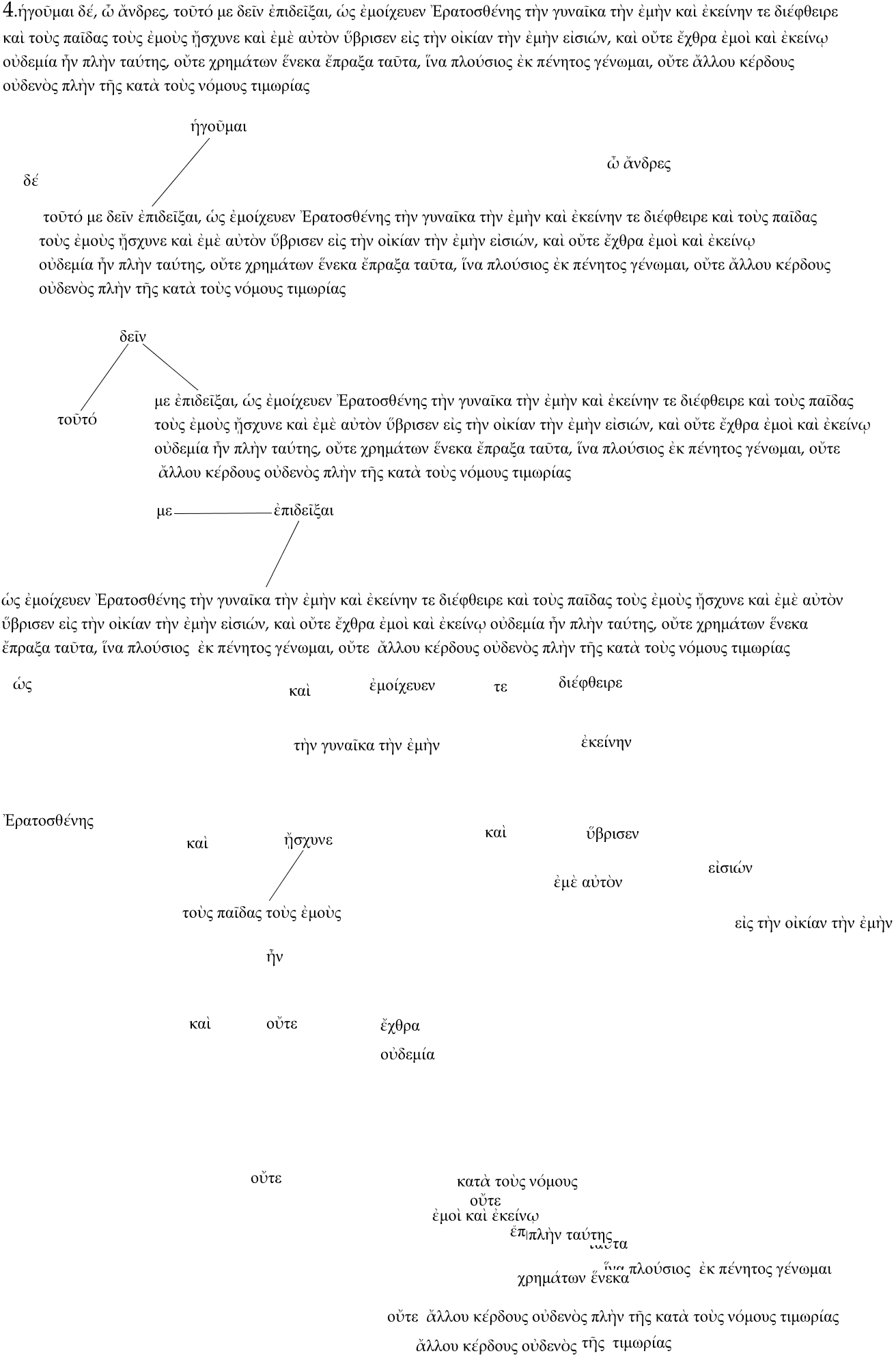 Este Cmap, tiene información relacionada con: frag.4, δεῖν ???? τοῦτό, με ἐπιδεῖξαι, ὡς ἐμοίχευεν Ἐρατοσθένης τὴν γυναῖκα τὴν ἐμὴν καὶ ἐκείνην τε διέφθειρε καὶ τοὺς παῖδας τοὺς ἐμοὺς ᾔσχυνε καὶ ἐμὲ αὐτὸν ὕβρισεν εἰς τὴν οἰκίαν τὴν ἐμὴν εἰσιών, καὶ οὔτε ἔχθρα ἐμοὶ καὶ ἐκείνῳ οὐδεμία ἦν πλὴν ταύτης, οὔτε χρημάτων ἕνεκα ἔπραξα ταῦτα, ἵνα πλούσιος ἐκ πένητος γένωμαι, οὔτε ἄλλου κέρδους οὐδενὸς πλὴν τῆς κατὰ τοὺς νόμους τιμωρίας ???? δεῖν, ἐπιδεῖξαι ???? ὡς ἐμοίχευεν Ἐρατοσθένης τὴν γυναῖκα τὴν ἐμὴν καὶ ἐκείνην τε διέφθειρε καὶ τοὺς παῖδας τοὺς ἐμοὺς ᾔσχυνε καὶ ἐμὲ αὐτὸν ὕβρισεν εἰς τὴν οἰκίαν τὴν ἐμὴν εἰσιών, καὶ οὔτε ἔχθρα ἐμοὶ καὶ ἐκείνῳ οὐδεμία ἦν πλὴν ταύτης, οὔτε χρημάτων ἕνεκα ἔπραξα ταῦτα, ἵνα πλούσιος ἐκ πένητος γένωμαι, οὔτε ἄλλου κέρδους οὐδενὸς πλὴν τῆς κατὰ τοὺς νόμους τιμωρίας, ἡγοῦμαι ???? τοῦτό με δεῖν ἐπιδεῖξαι, ὡς ἐμοίχευεν Ἐρατοσθένης τὴν γυναῖκα τὴν ἐμὴν καὶ ἐκείνην τε διέφθειρε καὶ τοὺς παῖδας τοὺς ἐμοὺς ᾔσχυνε καὶ ἐμὲ αὐτὸν ὕβρισεν εἰς τὴν οἰκίαν τὴν ἐμὴν εἰσιών, καὶ οὔτε ἔχθρα ἐμοὶ καὶ ἐκείνῳ οὐδεμία ἦν πλὴν ταύτης, οὔτε χρημάτων ἕνεκα ἔπραξα ταῦτα, ἵνα πλούσιος ἐκ πένητος γένωμαι, οὔτε ἄλλου κέρδους οὐδενὸς πλὴν τῆς κατὰ τοὺς νόμους τιμωρίας, με ???? ἐπιδεῖξαι, τοὺς παῖδας τοὺς ἐμοὺς ???? ᾔσχυνε