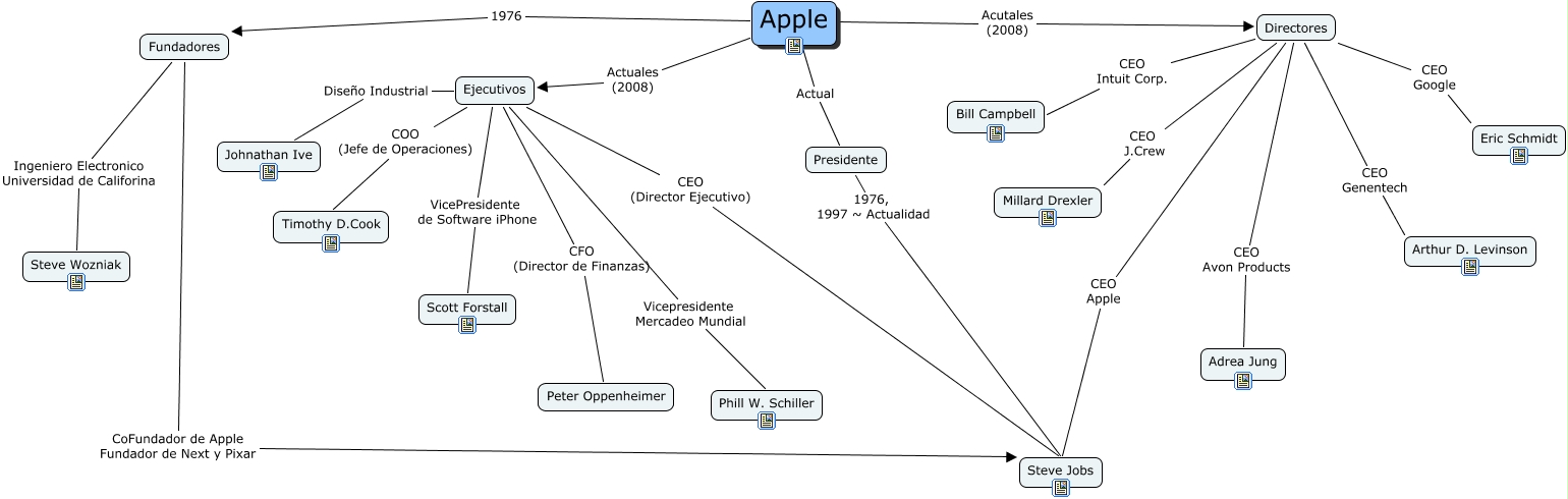 Este Cmap, tiene información relacionada con: Estructura Apple, Directores CEO Avon Products Adrea Jung, Directores CEO Intuit Corp. Bill Campbell, Apple Actual Presidente, Directores CEO Genentech Arthur D. Levinson, Ejecutivos Diseño Industrial Johnathan Ive, Ejecutivos CEO (Director Ejecutivo) Steve Jobs, Fundadores Ingeniero Electronico Universidad de Califorina Steve Wozniak, Ejecutivos VicePresidente de Software iPhone Scott Forstall, Directores CEO J.Crew Millard Drexler, Presidente 1976, 1997 ~ Actualidad Steve Jobs, Apple Acutales (2008) Directores, Ejecutivos Vicepresidente Mercadeo Mundial Phill W. Schiller, Directores CEO Apple Steve Jobs, Ejecutivos COO (Jefe de Operaciones) Timothy D.Cook, Ejecutivos CFO (Director de Finanzas) Peter Oppenheimer, Apple Actuales (2008) Ejecutivos, Fundadores CoFundador de Apple Fundador de Next y Pixar Steve Jobs, Apple 1976 Fundadores, Directores CEO Google Eric Schmidt