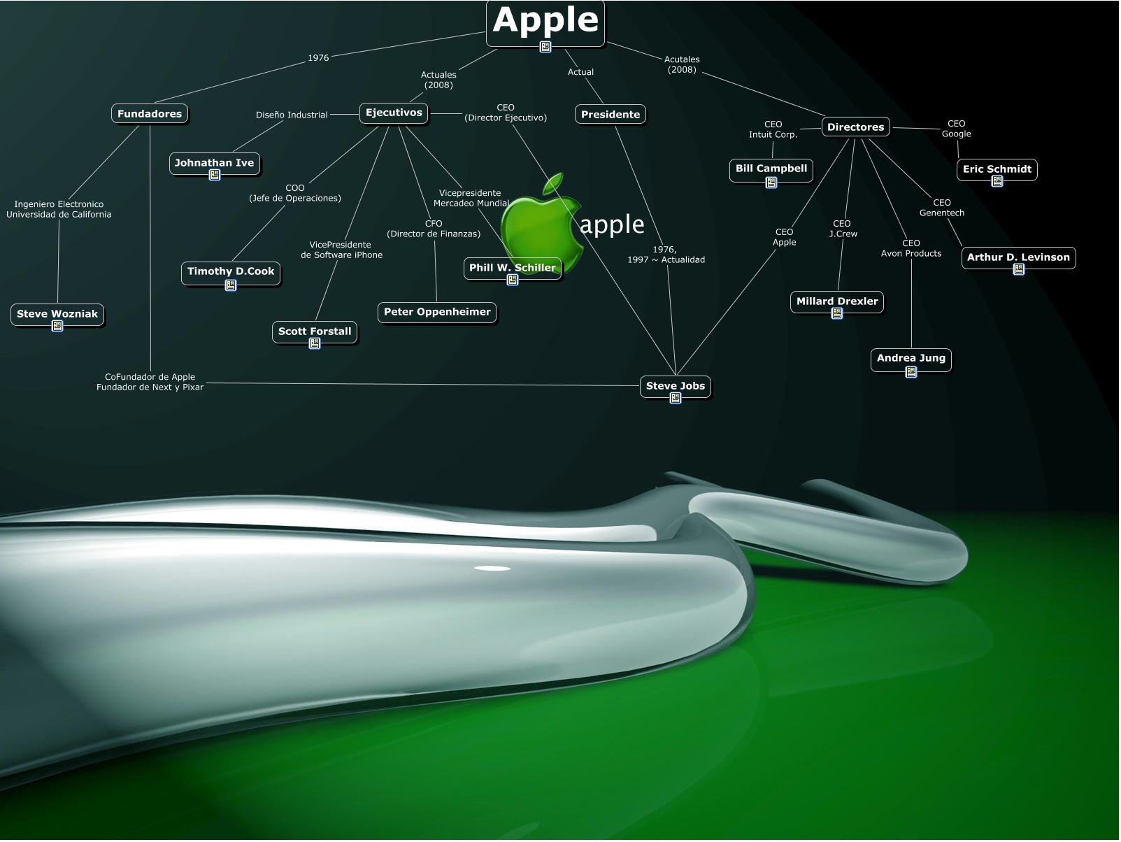 Este Cmap, tiene información relacionada con: Estructura Apple(Kenneth), Directores CEO Avon Products Andrea Jung, Directores CEO Genentech Arthur D. Levinson, Apple Actual Presidente, Directores CEO Intuit Corp. Bill Campbell, Ejecutivos Diseño Industrial Johnathan Ive, Ejecutivos CEO (Director Ejecutivo) Steve Jobs, Fundadores Ingeniero Electronico Universidad de California Steve Wozniak, Ejecutivos VicePresidente de Software iPhone Scott Forstall, Apple Acutales (2008) Directores, Presidente 1976, 1997 ~ Actualidad Steve Jobs, Directores CEO J.Crew Millard Drexler, Directores CEO Apple Steve Jobs, Ejecutivos Vicepresidente Mercadeo Mundial Phill W. Schiller, Ejecutivos COO (Jefe de Operaciones) Timothy D.Cook, Apple Actuales (2008) Ejecutivos, Ejecutivos CFO (Director de Finanzas) Peter Oppenheimer, Directores CEO Google Eric Schmidt, Apple 1976 Fundadores, Fundadores CoFundador de Apple Fundador de Next y Pixar Steve Jobs