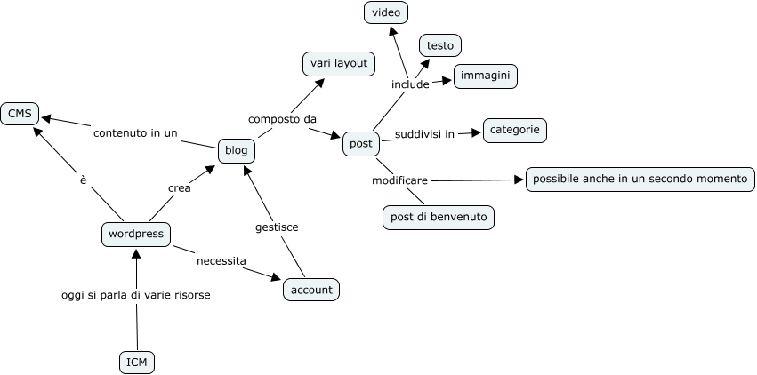 Questa Cmap, creata con IHMC CmapTools, contiene informazioni relative a: Blog, post suddivisi in categorie, blog composto da vari layout, post modificare possibile anche in un secondo momento, wordpress necessita account, account gestisce blog, post include immagini, post modificare post di benvenuto, ICM oggi si parla di varie risorse wordpress, wordpress è CMS, blog composto da post, post include video, wordpress crea blog, blog contenuto in un CMS, post include testo