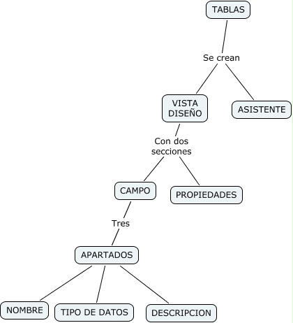 Este Cmap, tiene información relacionada con: TABLAS, APARTADOS DESCRIPCION, TABLAS Se crean ASISTENTE, VISTA DISEÑO Con dos secciones CAMPO, VISTA DISEÑO Con dos secciones PROPIEDADES, APARTADOS NOMBRE, APARTADOS TIPO DE DATOS, TABLAS Se crean VISTA DISEÑO, CAMPO Tres APARTADOS