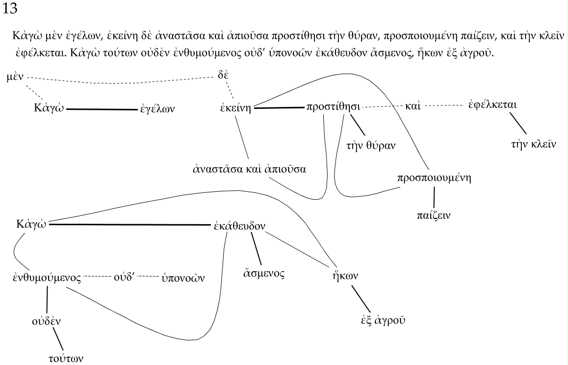 Este Cmap, tiene información relacionada con: frag.13 imprimir, Κἀγὼ ???? ἐκάθευδον, προσποιουμένη ???? προστίθησι, ἐγέλων ???? Κἀγὼ, ἀναστᾶσα καὶ ἀπιοῦσα ???? ἐκείνη, ἥκων ???? Κἀγὼ, μὲν ???? δὲ, Κἀγὼ ???? ἐνθυμούμενος, ἐκείνη ???? προστίθησι, τὴν θύραν ???? προστίθησι, δὲ ???? ἐκείνη, ἀναστᾶσα καὶ ἀπιοῦσα ???? προστίθησι, τούτων ???? οὐδὲν, τὴν κλεῖν ???? ἐφέλκεται, μὲν ???? Κἀγὼ, καὶ ???? προστίθησι, οὐδ’ ???? ἐνθυμούμενος, ἄσμενος ???? ἐκάθευδον, προσποιουμένη ???? παίζειν, ἐνθυμούμενος ???? ἐκάθευδον, ἐφέλκεται ???? καὶ