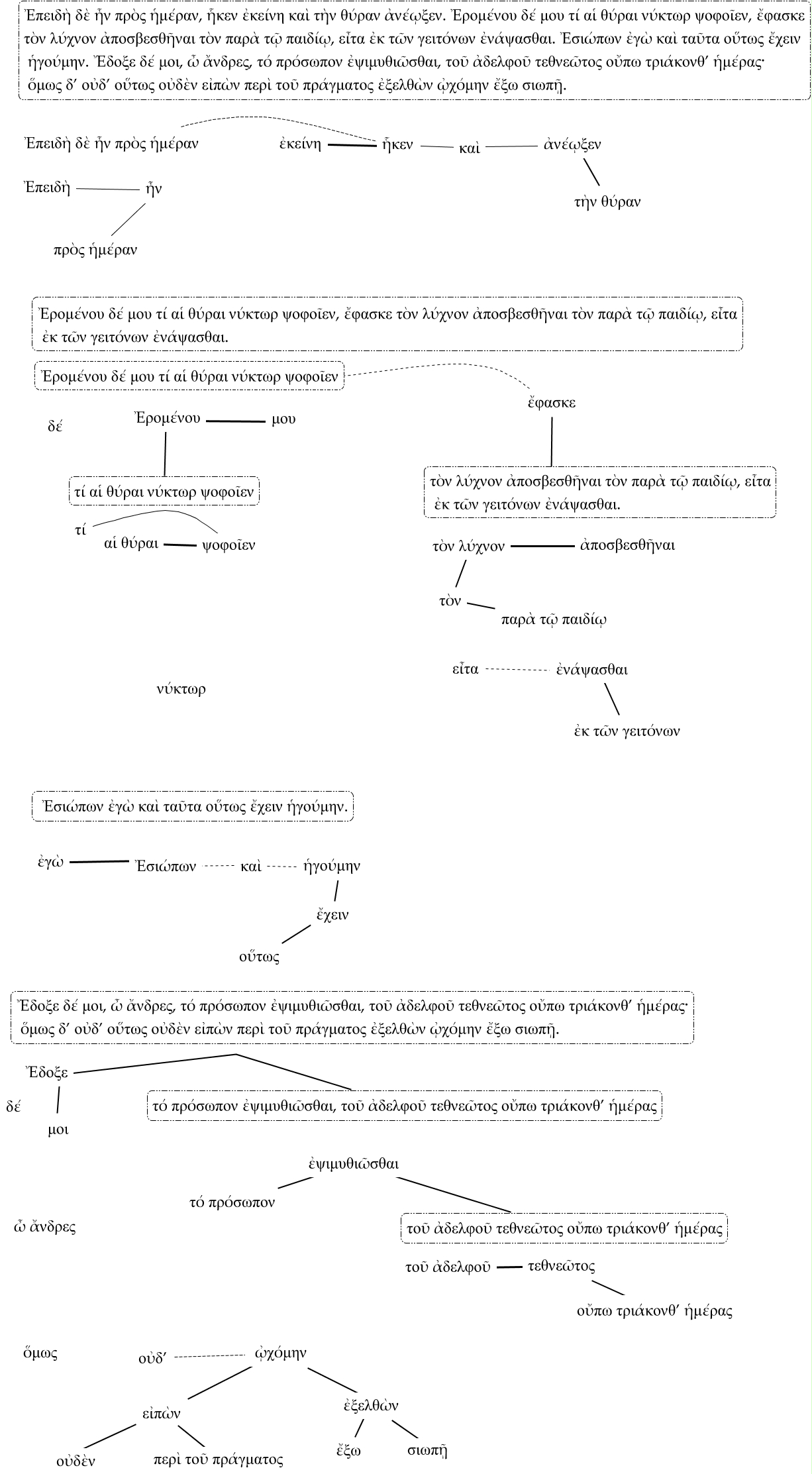 Este Cmap, tiene información relacionada con: frag.14 imprimir, τοῦ ἀδελφοῦ τεθνεῶτος οὔπω τριάκονθ’ ἡμέρας ???? ἐψιμυθιῶσθαι, τό πρόσωπον ???? ἐψιμυθιῶσθαι, οὐδ’ ???? εἰπὼν, ψοφοῖεν ???? αἱ θύραι, ἔφασκε ???? Ἐρομένου δέ μου τί αἱ θύραι νύκτωρ ψοφοῖεν, οὐδ’ ???? ᾠχόμην, ἀνέῳξεν ???? καὶ, εἶτα ???? ἐνάψασθαι, τεθνεῶτος ???? οὔπω τριάκονθ’ ἡμέρας, ἐξελθὼν ???? σιωπῇ, ἔχειν ???? ἡγούμην, τί αἱ θύραι νύκτωρ ψοφοῖεν ???? Ἐρομένου, εἰπὼν ???? περὶ τοῦ πράγματος, τὸν ???? τὸν λύχνον, παρὰ τῷ παιδίῳ ???? τὸν, καὶ ???? Ἐσιώπων, ἧκεν ???? καὶ, ᾠχόμην ???? ἔξω, ἐκείνη ???? ἧκεν, τεθνεῶτος ???? τοῦ ἀδελφοῦ