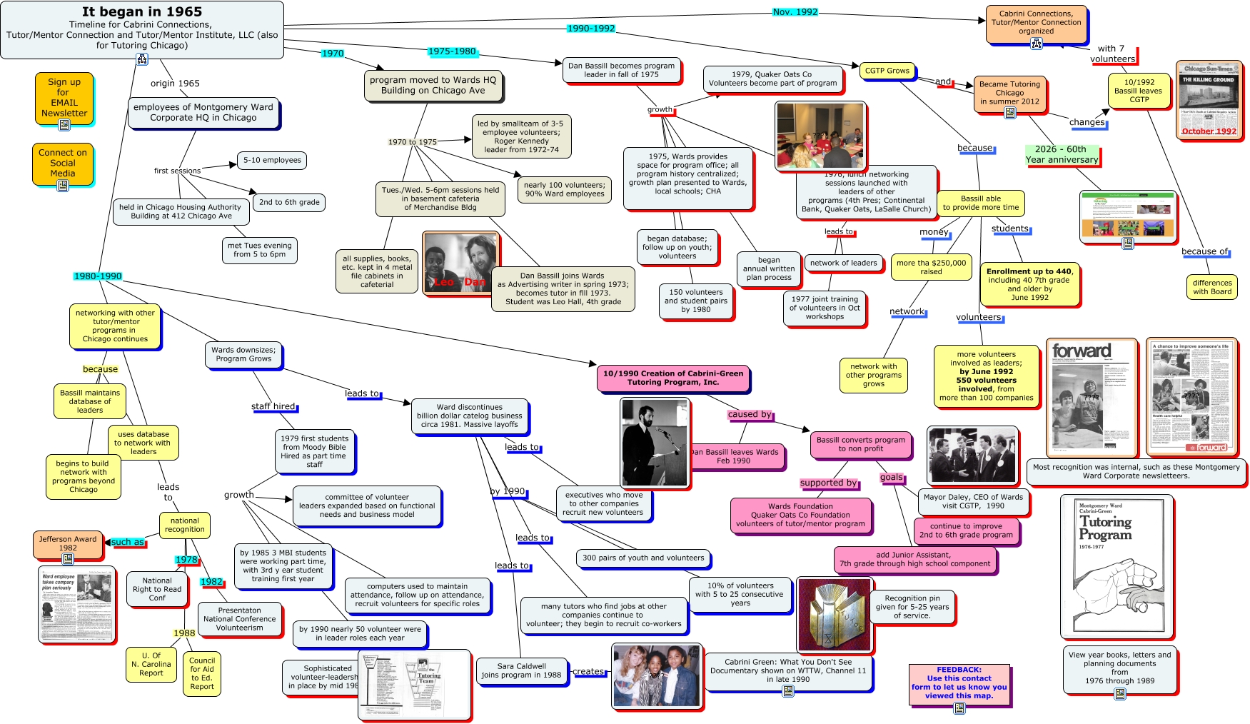 This Concept Map, created with IHMC CmapTools, has information related to: timeline 1965 to 1992, It began in 1965 Timeline for Cabrini Connections, Tutor/Mentor Connection and Tutor/Mentor Institute, LLC (also for Tutoring Chicago) origin 1965 employees of Montgomery Ward Corporate HQ in Chicago, Dan Bassill becomes program leader in fall of 1975 growth 150 volunteers and student pairs by 1980, employees of Montgomery Ward Corporate HQ in Chicago first sessions met Tues evening from 5 to 6pm, 1979 first students from Moody Bible Hired as part time staff growth computers used to maintain attendance, follow up on attendance, recruit volunteers for specific roles, employees of Montgomery Ward Corporate HQ in Chicago first sessions 5-10 employees, program moved to Wards HQ Building on Chicago Ave 1970 to 1975 led by smallteam of 3-5 employee volunteers; Roger Kennedy leader from 1972-74, employees of Montgomery Ward Corporate HQ in Chicago first sessions held in Chicago Housing Authority Building at 412 Chicago Ave, national recognition 1988 Council for Aid to Ed. Report, Bassill converts program to non profit goals add Junior Assistant, 7th grade through high school component, It began in 1965 Timeline for Cabrini Connections, Tutor/Mentor Connection and Tutor/Mentor Institute, LLC (also for Tutoring Chicago) 1980-1990 Wards downsizes; Program Grows, Became Tutoring Chicago in summer 2012 2026 - 60th Year anniversary, CGTP Grows and Became Tutoring Chicago in summer 2012, national recognition 1988 U. Of N. Carolina Report, 10/1992 Bassill leaves CGTP with 7 volunteers Cabrini Connections, Tutor/Mentor Connection organized, Bassill able to provide more time network network with other programs grows, Dan Bassill becomes program leader in fall of 1975 growth 1976, lunch networking sessions launched with leaders of other programs (4th Pres; Continental Bank, Quaker Oats, LaSalle Church), program moved to Wards HQ Building on Chicago Ave 1970 to 1975 Dan Bassill joins Wards as Advertising writer in spring 1973; becomes tutor in flll 1973. Student was Leo Hall, 4th grade, networking with other tutor/mentor programs in Chicago continues because Bassill maintains database of leaders, 10/1990 Creation of Cabrini-Green Tutoring Program, Inc. caused by Dan Bassill leaves Wards Feb 1990, Dan Bassill becomes program leader in fall of 1975 growth 1979, Quaker Oats Co Volunteers become part of program