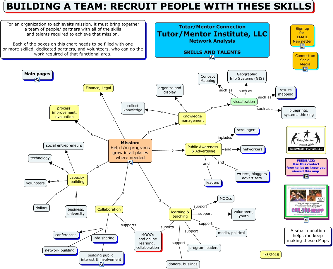This Concept Map, created with IHMC CmapTools, has information related to: Tutor Mentor Connection Network Analysis - Skills, capacity building c technology, learning & teaching support volunteers, youth, Collaboration in conferences, learning & teaching support program leaders, learning & teaching suports MOOCs and online learning, collaboration, Collaboration in building public interest & involvement, Public Awareness & Advertising includes scroungers, Knowledge management c visualization, visualization such as Concept Mapping, Collaboration supports MOOCs and online learning, collaboration, visualization such as blueprints, systems thinking, Public Awareness & Advertising and networkers, learning & teaching support donors, busiines, Collaboration in network building, learning & teaching support media, political, capacity building b volunteers, visualization such as results mapping, Mission: Help t/m programs grow in all places where needed 5 capacity building, Knowledge management a collect knowledge, Mission: Help t/m programs grow in all places where needed 1 Knowledge management