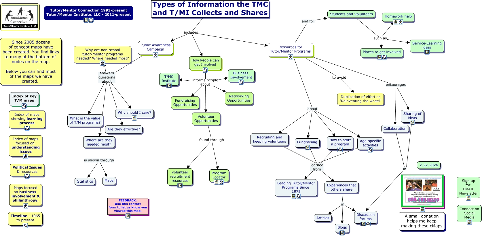 This Concept Map, created with IHMC CmapTools, has information related to: Information we Collect and Share, Types of Information the TMC and T/MI Collects and Shares includes How People can get Involved, Age-specific activities learned from Experiences that others share, How People can get Involved informs people about Business Involvement, Age-specific activities learned from Leading Tutor/Mentor Programs Since 1975, Students and Volunteers such as Places to get involved, Fundraising learned from Leading Tutor/Mentor Programs Since 1975, Resources for Tutor/Mentor Programs about Fundraising, Types of Information the TMC and T/MI Collects and Shares includes Public Awareness Campaign, How People can get Involved informs people about T/MC Institute, How to start a program learned from Leading Tutor/Mentor Programs Since 1975, Volunteer Opportunities found through Program Locator, Public Awareness Campaign answers questions about Are they effective?, Recruiting and keeping volunteers learned from Leading Tutor/Mentor Programs Since 1975, Resources for Tutor/Mentor Programs to avoid Duplication of effort or "Reinventing the wheel", Resources for Tutor/Mentor Programs about How to start a program, Sharing of ideas in Discussion forums, Resources for Tutor/Mentor Programs encourages Collaboration, Public Awareness Campaign answers questions about Why are non-school tutor/mentor programs needed? Where needed most?, Resources for Tutor/Mentor Programs about Recruiting and keeping volunteers, How People can get Involved informs people about Volunteer Opportunities